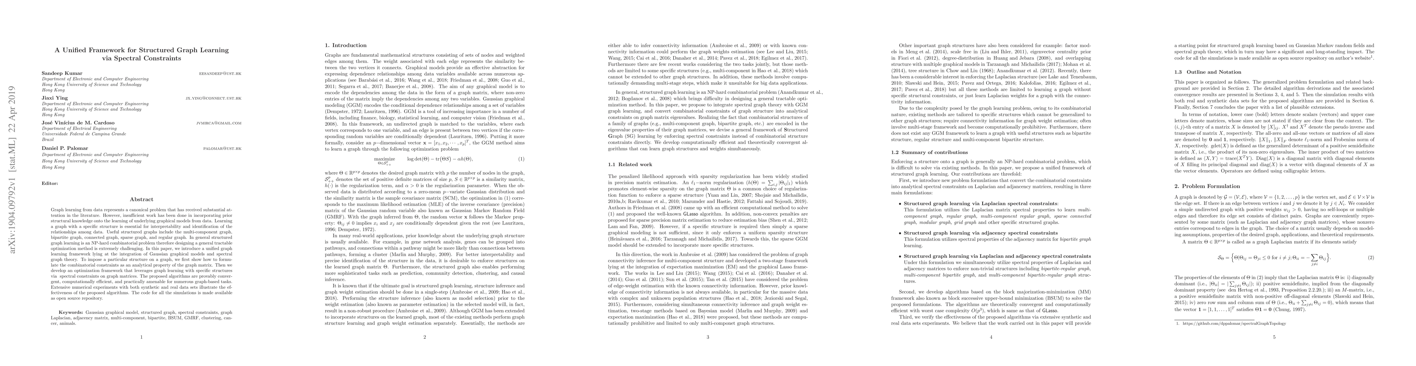 This paper presents a unified framework for structured graph learning by integrating Gaussian graphical models with spectral graph theory. The authors propose a method to impose specific structural constraints on graph matrices through spectral constraints, ensuring computational efficiency and convergence. The effectiveness of the proposed algorithms is demonstrated through extensive experiments on synthetic and real datasets.