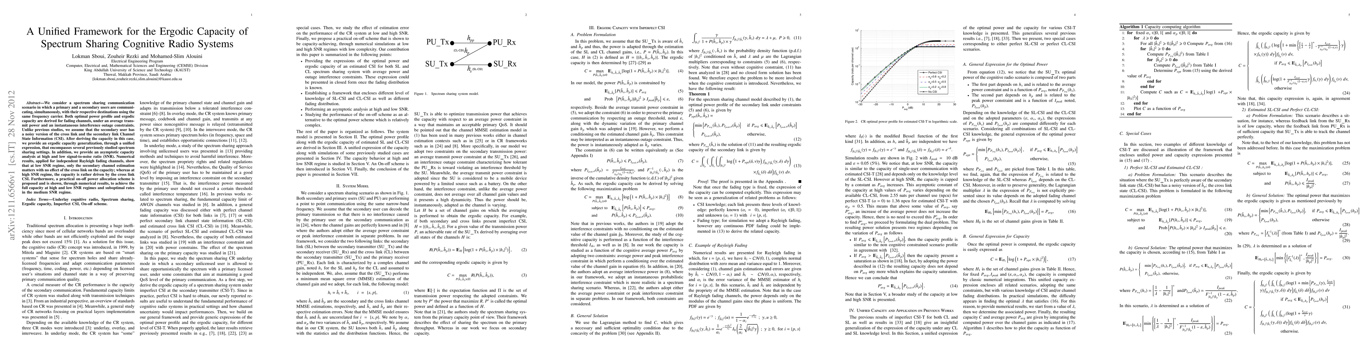 We consider a spectrum sharing communication scenario in which a primary and a secondary users are communicating, simultaneously, with their respective destinations using the same frequency carrier. Both optimal power profile and ergodic capacity are derived for fading channels, under an average transmit power and an instantaneous interference outage constraints. Unlike previous studies, we assume that the secondary user has a noisy version of the cross link and the secondary link Channel State Information (CSI). After deriving the capacity in this case, we provide an ergodic capacity generalization, through a unified expression, that encompasses several previously studied spectrum sharing settings. In addition, we provide an asymptotic capacity analysis at high and low signal-to-noise ratio (SNR). Numerical results, applied for independent Rayleigh fading channels, show that at low SNR regime, only the secondary channel estimation matters with no effect of the cross link on the capacity; whereas at high SNR regime, the capacity is rather driven by the cross link CSI. Furthermore, a practical on-off power allocation scheme is proposed and is shown, through numerical results, to achieve the full capacity at high and low SNR