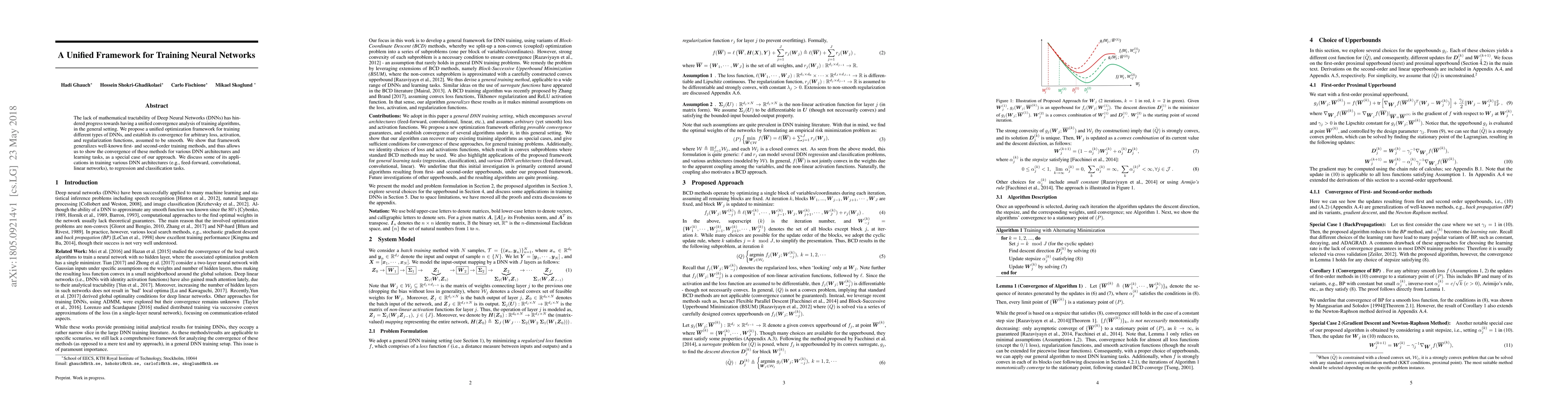The lack of mathematical tractability of Deep Neural Networks (DNNs) has hindered progress towards having a unified convergence analysis of training algorithms, in the general setting. We propose a unified optimization framework for training different types of DNNs, and establish its convergence for arbitrary loss, activation, and regularization functions, assumed to be smooth. We show that framework generalizes well-known first- and second-order training methods, and thus allows us to show the convergence of these methods for various DNN architectures and learning tasks, as a special case of our approach. We discuss some of its applications in training various DNN architectures (e.g., feed-forward, convolutional, linear networks), to regression and classification tasks.