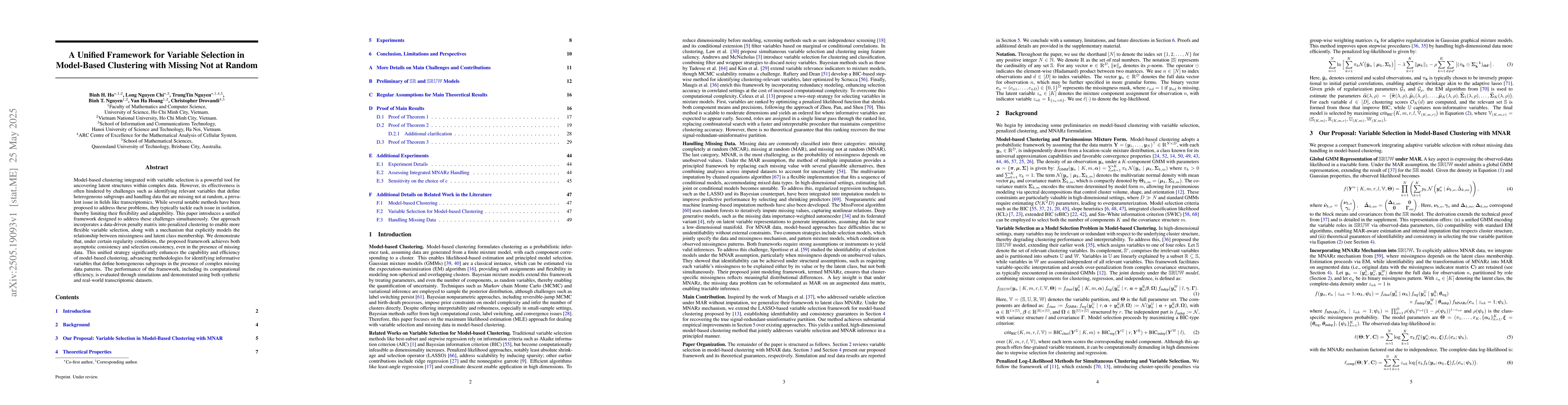 The introduction of a unified framework that combines variable selection with handling missing not at random data in model-based clustering.