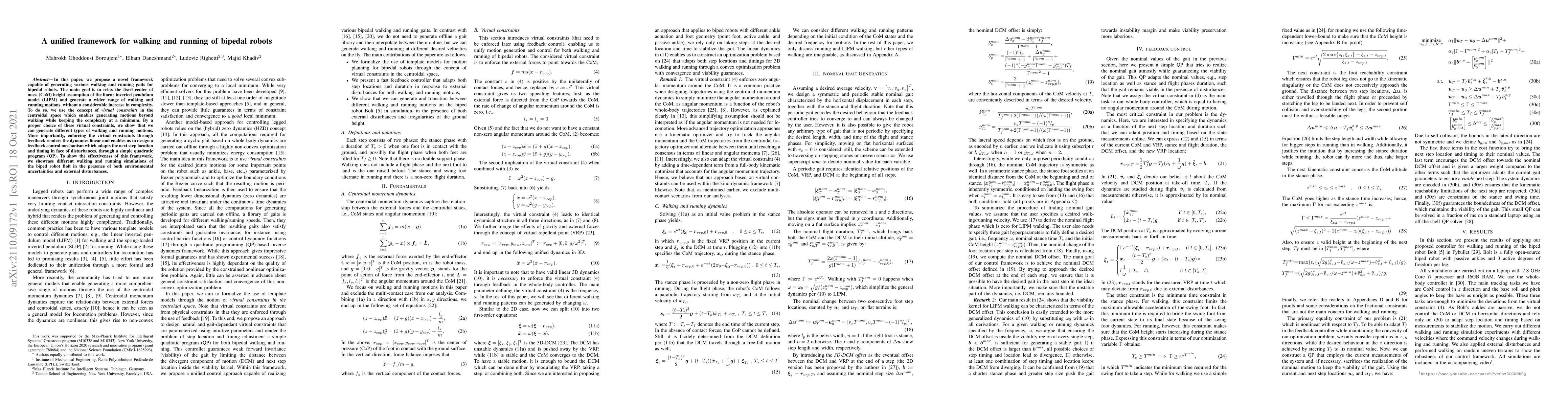 This paper introduces a unified framework for generating diverse walking and running gaits in bipedal robots, relaxing the fixed center of mass height assumption. It employs virtual constraints in centroidal space to extend motion capabilities while maintaining simplicity, and uses a feedback control mechanism based on a quadratic program to adapt to disturbances.