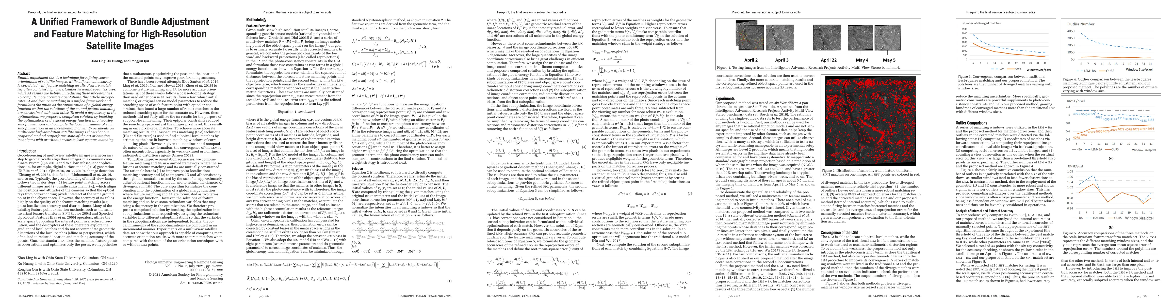 Bundle adjustment (BA) is a technique for refining sensor orientations of satellite images, while adjustment accuracy is correlated with feature matching results. Feature match-ing often contains high uncertainties in weak/repeat textures, while BA results are helpful in reducing these uncertainties. To compute more accurate orientations, this article incorpo-rates BA and feature matching in a unified framework and formulates the union as the optimization of a global energy function so that the solutions of the BA and feature matching are constrained with each other. To avoid a degeneracy in the optimization, we propose a comprised solution by breaking the optimization of the global energy function into two-step suboptimizations and compute the local minimums of each suboptimization in an incremental manner. Experiments on multi-view high-resolution satellite images show that our proposed method outperforms state-of-the-art orientation techniques with or without accurate least-squares matching.