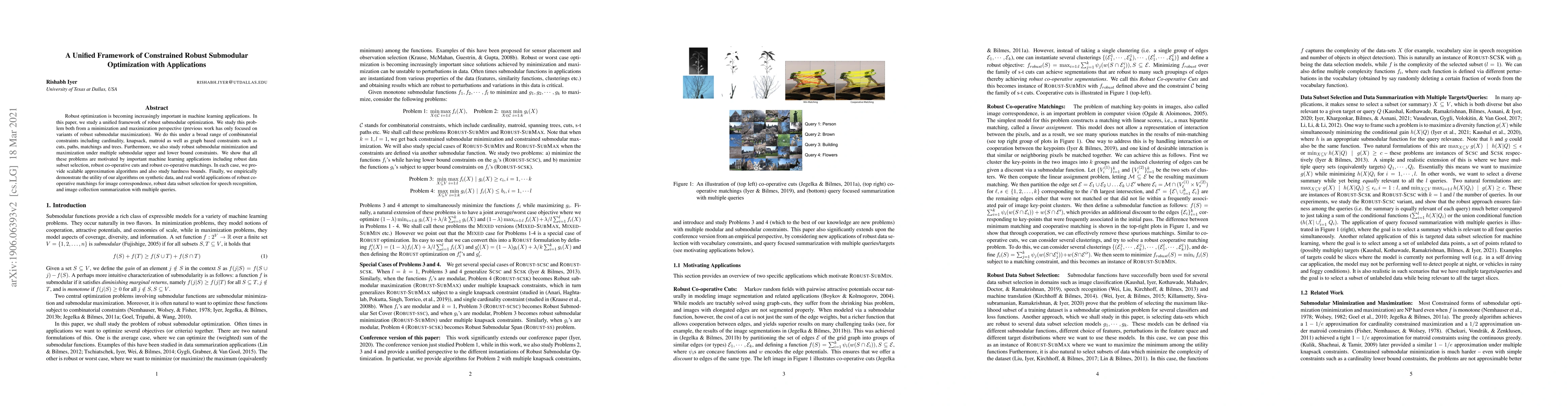 Robust optimization is becoming increasingly important in machine learning applications. In this paper, we study a unified framework of robust submodular optimization. We study this problem both from a minimization and maximization perspective (previous work has only focused on variants of robust submodular maximization). We do this under a broad range of combinatorial constraints including cardinality, knapsack, matroid as well as graph-based constraints such as cuts, paths, matchings and trees. Furthermore, we also study robust submodular minimization and maximization under multiple submodular upper and lower bound constraints. We show that all these problems are motivated by important machine learning applications including robust data subset selection, robust co-operative cuts and robust co-operative matchings. In each case, we provide scalable approximation algorithms and also study hardness bounds. Finally, we empirically demonstrate the utility of our algorithms on synthetic data, and real-world applications of robust cooperative matchings for image correspondence, robust data subset selection for speech recognition, and image collection summarization with multiple queries.