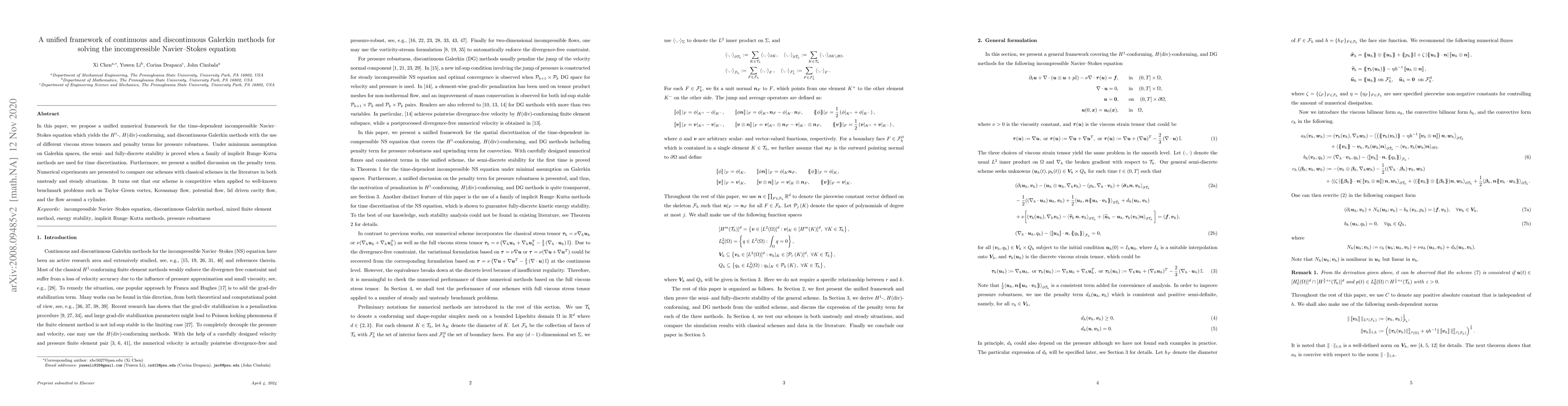 This paper proposes a unified framework for solving the incompressible Navier-Stokes equation, integrating continuous and discontinuous Galerkin methods with various viscous stress tensors and penalty terms for pressure stability. The framework is shown to be stable under implicit Runge-Kutta time discretization, and numerical experiments demonstrate its competitiveness against classical methods on benchmark problems.