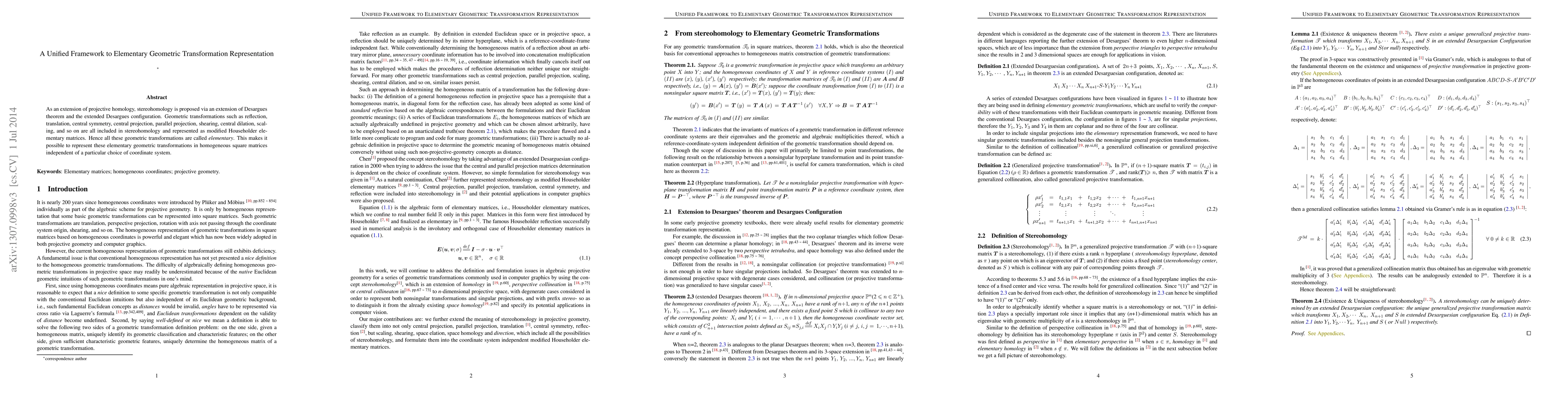 As an extension of projective homology, stereohomology is proposed via an extension of Desargues theorem and the extended Desargues configuration. Geometric transformations such as reflection, translation, central symmetry, central projection, parallel projection, shearing, central dilation, scaling, and so on are all included in stereohomology and represented as Householder-Chen elementary matrices. Hence all these geometric transformations are called elementary. This makes it possible to represent these elementary geometric transformations in homogeneous square matrices independent of a particular choice of coordinate system.
