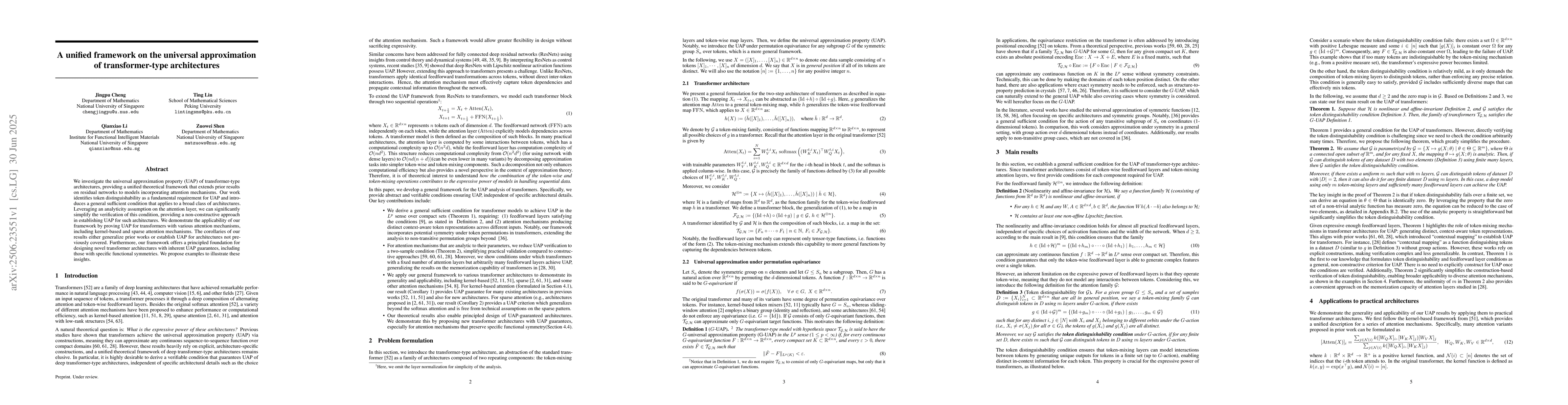 This research establishes a unified theoretical framework for the universal approximation property (UAP) of transformer-type architectures, extending previous results on residual networks. It identifies token distinguishability as crucial and introduces a general condition for UAP, verified via an analyticity assumption on attention layers, applicable to various attention mechanisms including kernel-based and sparse ones.