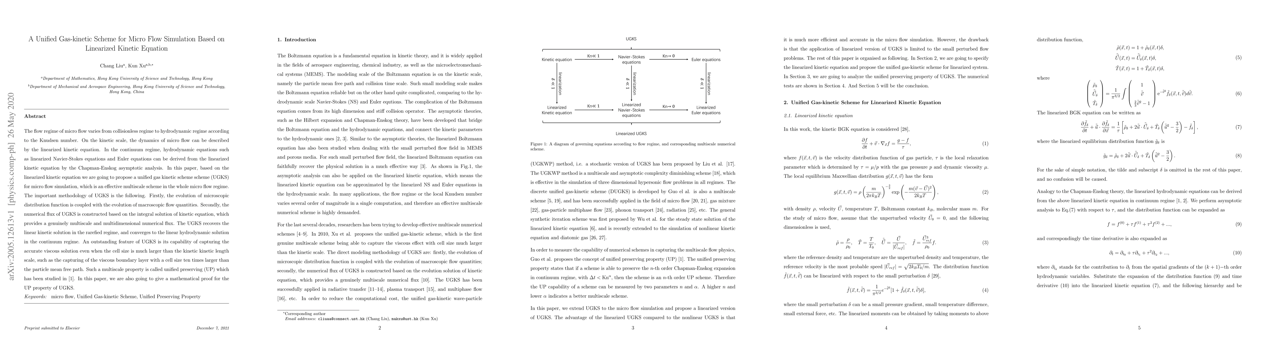 The flow regime of micro flow varies from collisionless regime to hydrodynamic regime according to the Knudsen number. On the kinetic scale, the dynamics of micro flow can be described by the linearized kinetic equation. In the continuum regime, hydrodynamic equations such as linearized Navier-Stokes equations and Euler equations can be derived from the linearized kinetic equation by the Chapman-Enskog asymptotic analysis. In this paper, based on the linearized kinetic equation we are going to propose a unified gas kinetic scheme scheme (UGKS) for micro flow simulation, which is an effective multiscale scheme in the whole micro flow regime. The important methodology of UGKS is the following. Firstly, the evolution of microscopic distribution function is coupled with the evolution of macroscopic flow quantities. Secondly, the numerical flux of UGKS is constructed based on the integral solution of kinetic equation, which provides a genuinely multiscale and multidimensional numerical flux. The UGKS recovers the linear kinetic solution in the rarefied regime, and converges to the linear hydrodynamic solution in the continuum regime. An outstanding feature of UGKS is its capability of capturing the accurate viscous solution even when the cell size is much larger than the kinetic kinetic length scale, such as the capturing of the viscous boundary layer with a cell size ten times larger than the particle mean free path. Such a multiscale property is called unified preserving (UP) which has been studied in \cite{guo2019unified}. In this paper, we are also going to give a mathematical proof for the UP property of UGKS.