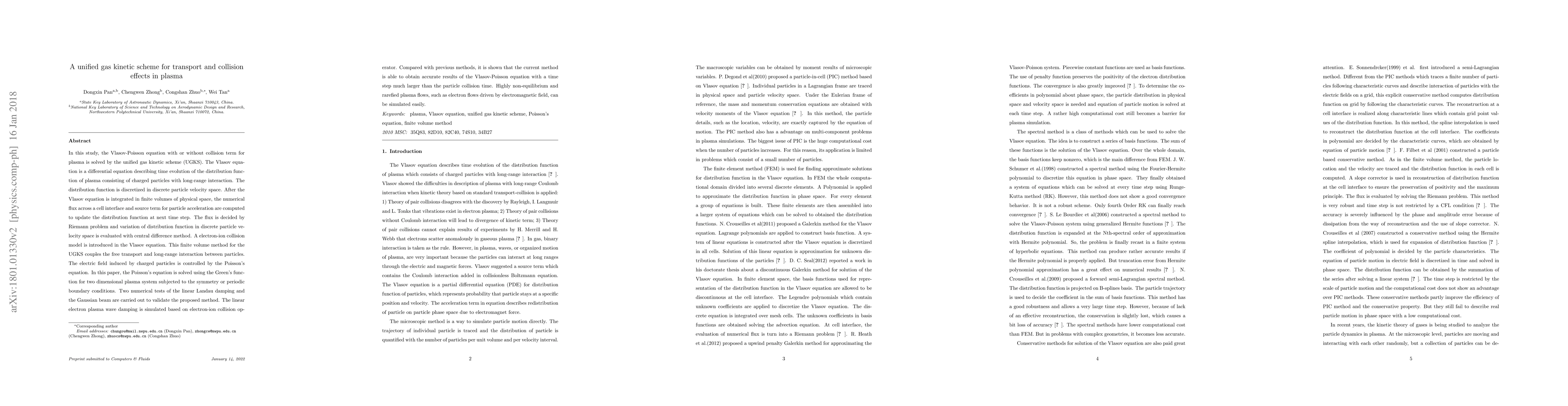 A new method called unified gas kinetic scheme (UGKS) is proposed to solve the Vlasov-Poisson equation for plasma simulation, enabling accurate results with larger time steps than previous methods.