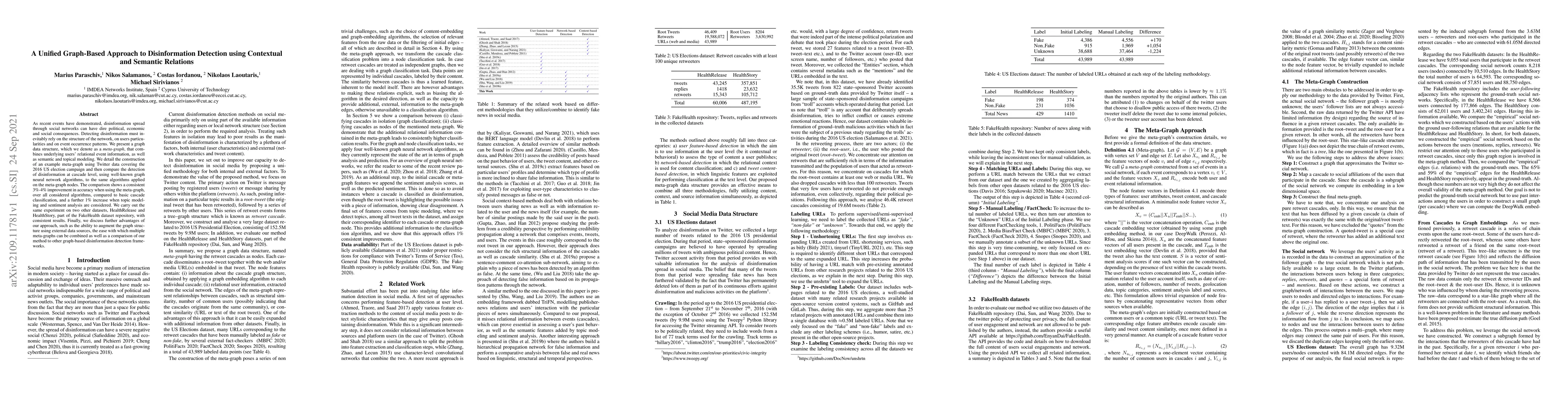 This paper proposes a unified graph-based approach to detect disinformation using a meta-graph that integrates contextual and semantic relations, showing a 3%-4% improvement in accuracy over basic cascade classification methods. The method is validated across multiple datasets, demonstrating consistent results and additional benefits like augmentability and combinability.
