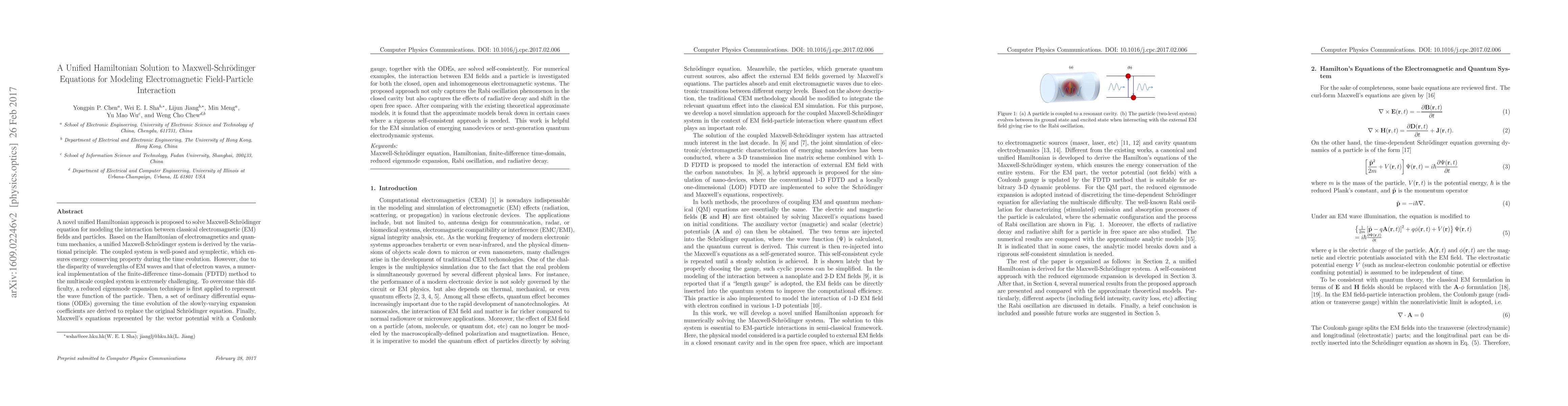 A novel unified Hamiltonian approach is proposed to solve Maxwell-Schrodinger equation for modeling the interaction between classical electromagnetic (EM) fields and particles. Based on the Hamiltonian of electromagnetics and quantum mechanics, a unified Maxwell-Schrodinger system is derived by the variational principle. The coupled system is well-posed and symplectic, which ensures energy conserving property during the time evolution. However, due to the disparity of wavelengths of EM waves and that of electron waves, a numerical implementation of the finite-difference time-domain (FDTD) method to the multiscale coupled system is extremely challenging. To overcome this difficulty, a reduced eigenmode expansion technique is first applied to represent the wave function of the particle. Then, a set of ordinary differential equations (ODEs) governing the time evolution of the slowly-varying expansion coefficients are derived to replace the original Schrodinger equation. Finally, Maxwell's equations represented by the vector potential with a Coulomb gauge, together with the ODEs, are solved self-consistently. For numerical examples, the interaction between EM fields and a particle is investigated for both the closed, open and inhomogeneous electromagnetic systems. The proposed approach not only captures the Rabi oscillation phenomenon in the closed cavity but also captures the effects of radiative decay and shift in the open free space. After comparing with the existing theoretical approximate models, it is found that the approximate models break down in certain cases where a rigorous self-consistent approach is needed. This work is helpful for the EM simulation of emerging nanodevices or next-generation quantum electrodynamic systems.
