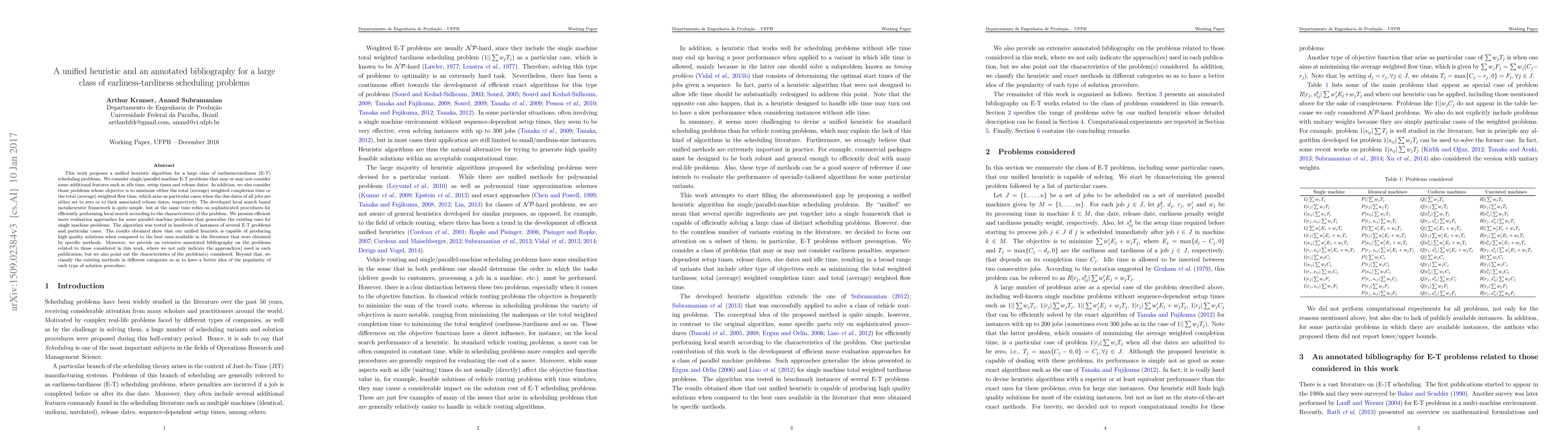 This work proposes a unified heuristic algorithm for a large class of earliness-tardiness (E-T) scheduling problems. We consider single/parallel machine E-T problems that may or may not consider some additional features such as idle time, setup times and release dates. In addition, we also consider those problems whose objective is to minimize either the total (average) weighted completion time or the total (average) weighted flow time, which arise as particular cases when the due dates of all jobs are either set to zero or to their associated release dates, respectively. The developed local search based metaheuristic framework is quite simple, but at the same time relies on sophisticated procedures for efficiently performing local search according to the characteristics of the problem. We present efficient move evaluation approaches for some parallel machine problems that generalize the existing ones for single machine problems. The algorithm was tested in hundreds of instances of several E-T problems and particular cases. The results obtained show that our unified heuristic is capable of producing high quality solutions when compared to the best ones available in the literature that were obtained by specific methods. Moreover, we provide an extensive annotated bibliography on the problems related to those considered in this work, where we not only indicate the approach(es) used in each publication, but we also point out the characteristics of the problem(s) considered. Beyond that, we classify the existing methods in different categories so as to have a better idea of the popularity of each type of solution procedure.