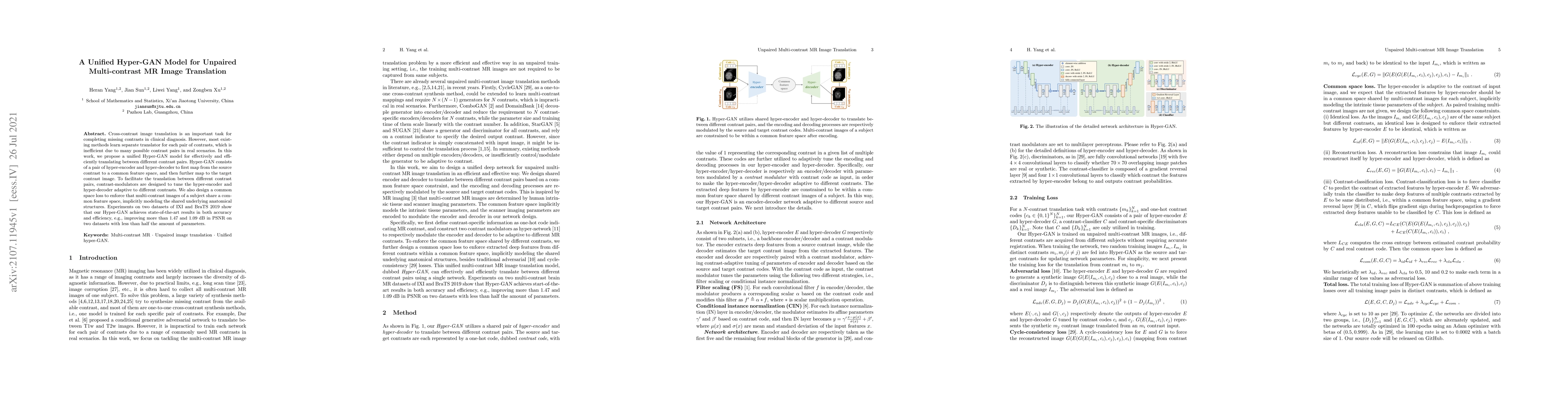 Cross-contrast image translation is an important task for completing missing contrasts in clinical diagnosis. However, most existing methods learn separate translator for each pair of contrasts, which is inefficient due to many possible contrast pairs in real scenarios. In this work, we propose a unified Hyper-GAN model for effectively and efficiently translating between different contrast pairs. Hyper-GAN consists of a pair of hyper-encoder and hyper-decoder to first map from the source contrast to a common feature space, and then further map to the target contrast image. To facilitate the translation between different contrast pairs, contrast-modulators are designed to tune the hyper-encoder and hyper-decoder adaptive to different contrasts. We also design a common space loss to enforce that multi-contrast images of a subject share a common feature space, implicitly modeling the shared underlying anatomical structures. Experiments on two datasets of IXI and BraTS 2019 show that our Hyper-GAN achieves state-of-the-art results in both accuracy and efficiency, e.g., improving more than 1.47 and 1.09 dB in PSNR on two datasets with less than half the amount of parameters.