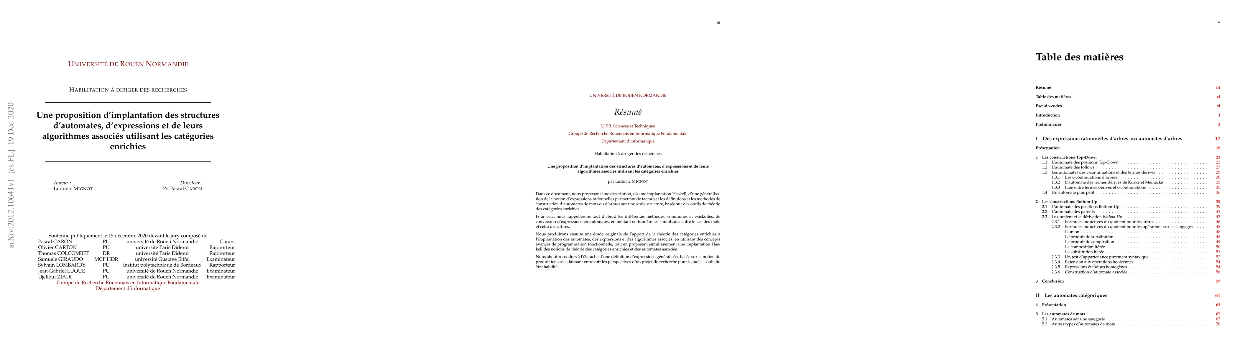 In this document, we propose a description, via a Haskell implementation, of a generalization of the notion of regular expression allowing us to group the definitions and the methods of (tree or word) automata constructions over one generic structure, based on enriched category theory tools. We first recall several methods of conversion from expressions to automata, enlightening the similarities between the words and trees cases. We then produce an original study of the power of enriched category theory applied 1) to automata and expressions implementation, and 2) to the study of associated algorithms, using advanced concepts of functional programming, while simultaneously constructing a Haskell implementation of notions of enriched category theory and associated automata. More precisely, the Haskell implementation and the algebraic definition of the generic automaton structure are based on the following ideas: - enriched categories, enriched functors, enriched monads, etc. can be implemented in Haskell; - Type level programming can be used to properly encode function arity; - monoids (word structure) and operads (tree structure) can be encoded as monoid objects; - tree and word automata can be represented by the same algebraic structure, via enriched categories. This generalization leads to surprising remarks. As an example, some classical algorithms (determinization, completion, conversion from alternating to deterministic automaton) can be regrouped in only one function. We will then define a notion of generalized expressions based on the notion of monoidal tensor product. Haskell sources are available at: http://ludovicmignot.free.fr/HDR/src-HDR.zip