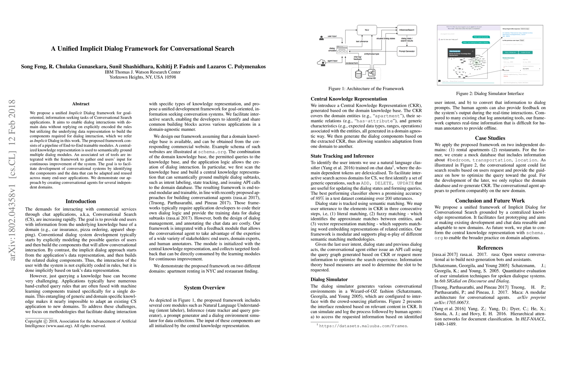 This paper introduces a unified Implicit Dialog framework for conversational search, enabling goal-oriented interactions without explicit rule encoding, using data representation for dialog components. The framework includes end-to-end trainable modules and tools for continuous user input integration, aiming to simplify the development of adaptable conversational systems across various domains.