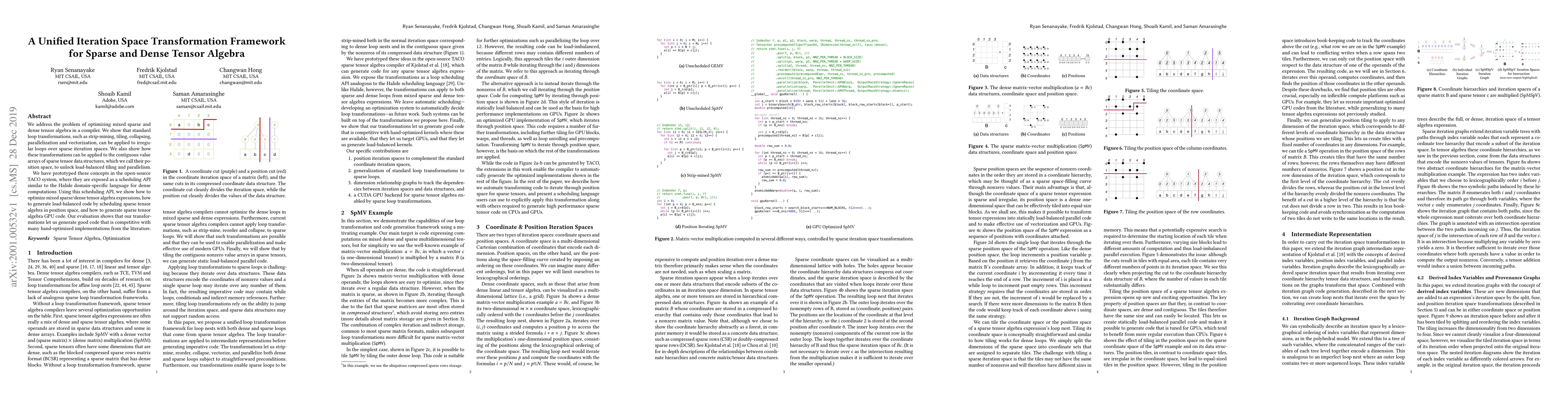 This paper presents a unified framework for optimizing mixed sparse and dense tensor algebra in compilers, demonstrating the application of standard loop transformations to sparse iteration spaces and contiguous value arrays. The proposed scheduling API in the TACO system enables the generation of load-balanced and GPU-optimized code, achieving competitive performance against hand-optimized implementations.