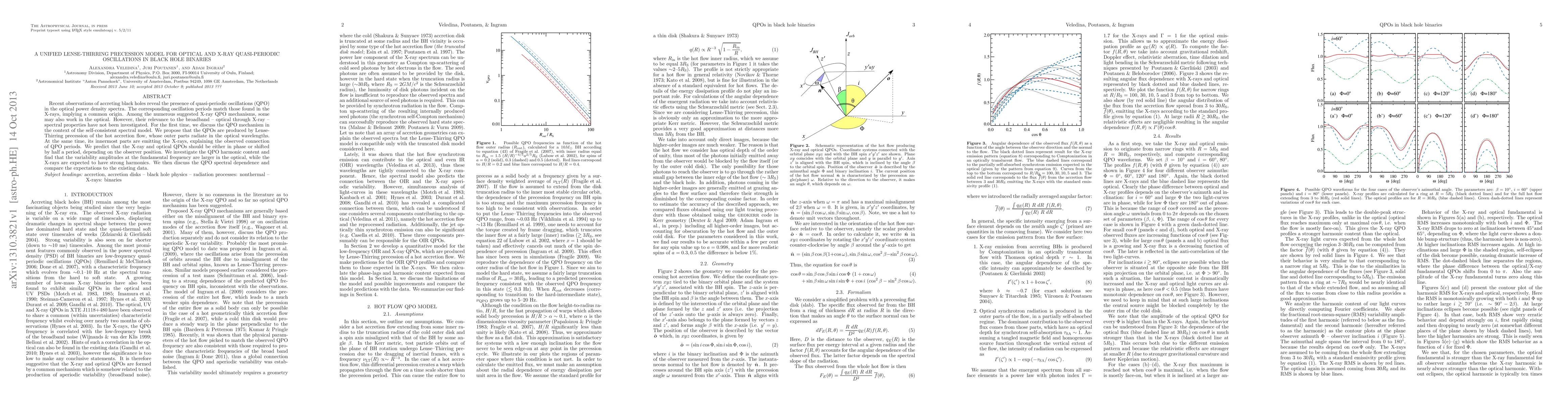 Recent observations of accreting black holes reveal the presence of quasi-periodic oscillations (QPO) in the optical power density spectra. The corresponding oscillation periods match those found in the X-rays, implying a common origin. Among the numerous suggested X-ray QPO mechanisms, some may also work in the optical. However, their relevance to the broadband -- optical through X-ray -- spectral properties have not been investigated. For the first time, we discuss the QPO mechanism in the context of the self-consistent spectral model. We propose that the QPOs are produced by Lense-Thirring precession of the hot accretion flow, whose outer parts radiate in the optical wavelengths. At the same time, its innermost parts are emitting the X-rays, explaining the observed connection of QPO periods. We predict that the X-ray and optical QPOs should be either in phase or shifted by half a period, depending on the observer position. We investigate the QPO harmonic content and find that the variability amplitudes at the fundamental frequency are larger in the optical, while the X-rays are expected to have strong harmonics. We then discuss the QPO spectral dependence and compare the expectations to the existing data.