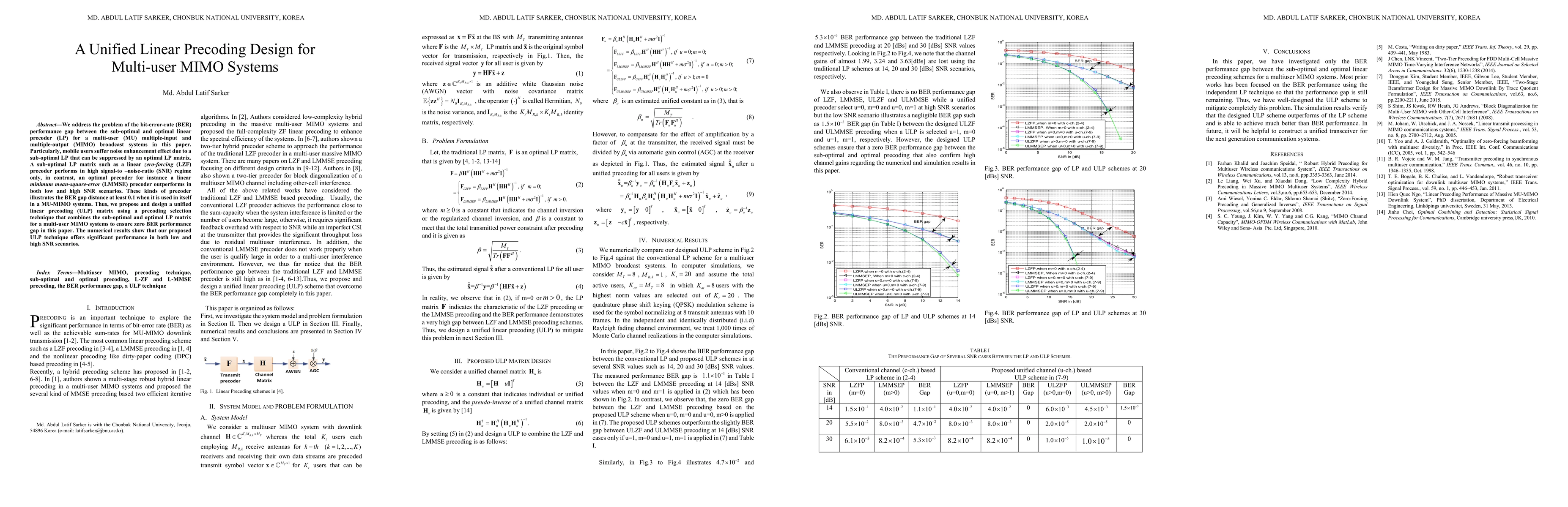 This paper proposes a unified linear precoding (ULP) matrix to bridge the bit error rate (BER) performance gap between sub-optimal and optimal linear precoders in multi-user MIMO systems. The ULP combines sub-optimal and optimal precoding techniques to achieve zero BER performance gap across both low and high SNR scenarios, outperforming existing methods.