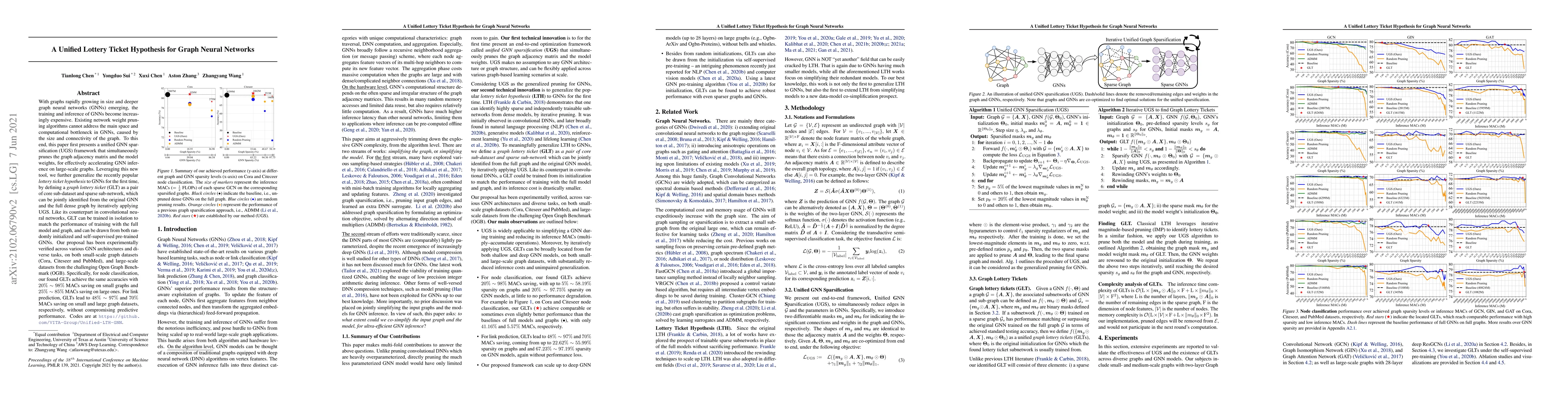 This paper introduces a unified GNN sparsification framework to accelerate inference in large-scale graph neural networks by simultaneously pruning the graph adjacency matrix and model weights. It extends the lottery ticket hypothesis to GNNs, identifying a graph lottery ticket (GLT) that achieves comparable performance with significant computational savings on both small and large graph datasets.