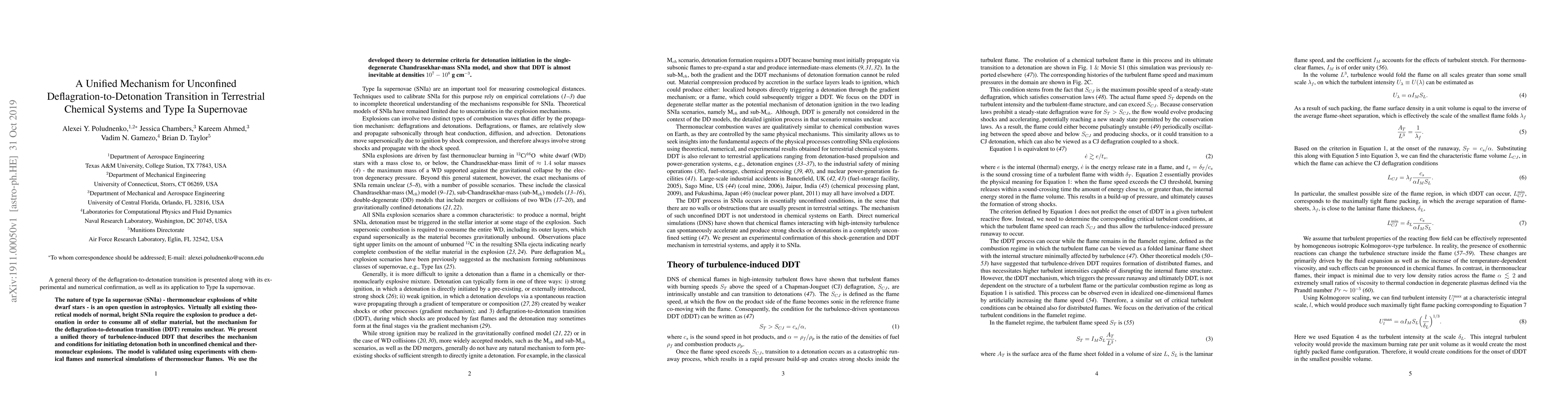 This paper proposes a unified theory of turbulence-induced deflagration-to-detonation transition (DDT) for both terrestrial chemical and thermonuclear explosions, validated through experiments and simulations. The theory suggests DDT is almost inevitable in the single degenerate Chandrasekhar-mass Type Ia supernova model at densities of 10^7 - 10^8 g/cc.