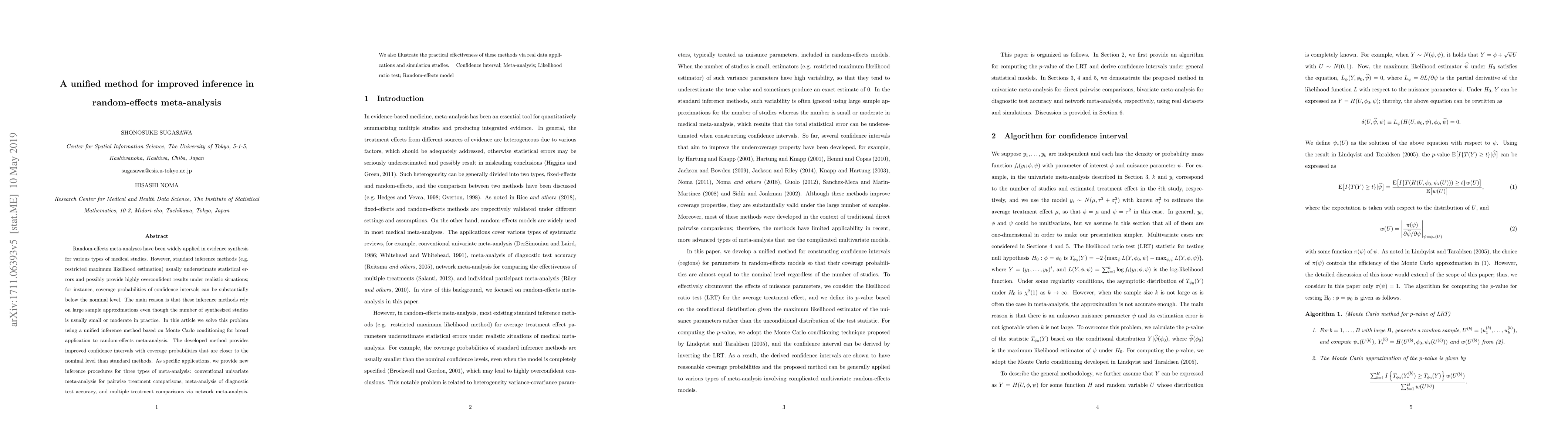 This paper proposes a unified inference method based on Monte Carlo conditioning to improve random-effects meta-analysis, addressing the underestimation of statistical errors in standard methods. The new approach provides more accurate confidence intervals with coverage probabilities closer to the nominal level, demonstrated through applications in univariate, diagnostic test accuracy, and network meta-analyses.