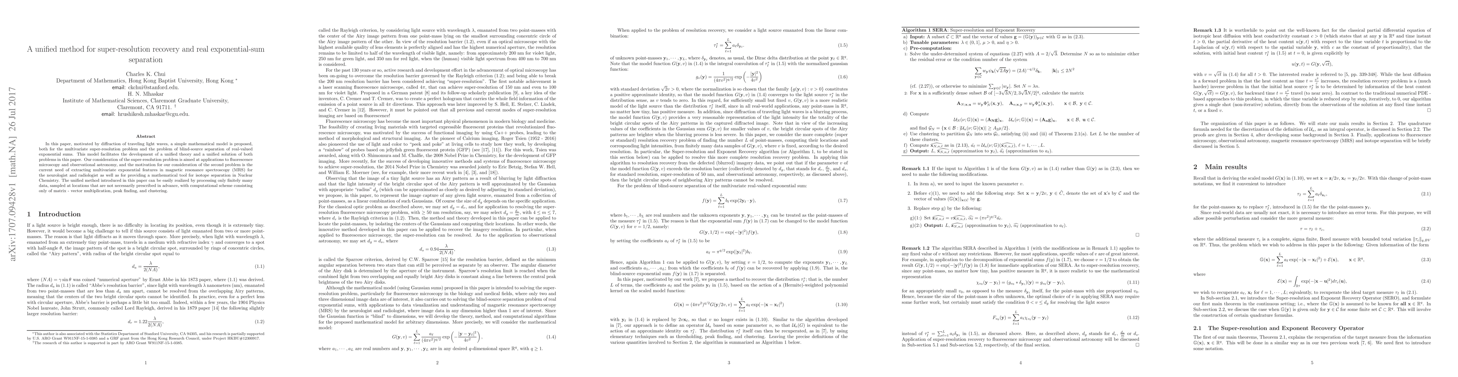 A unified method recovers super-resolution in microscopy and separates real exponential-sums using a simple mathematical model that can be computed with matrix-vector multiplication and clustering.