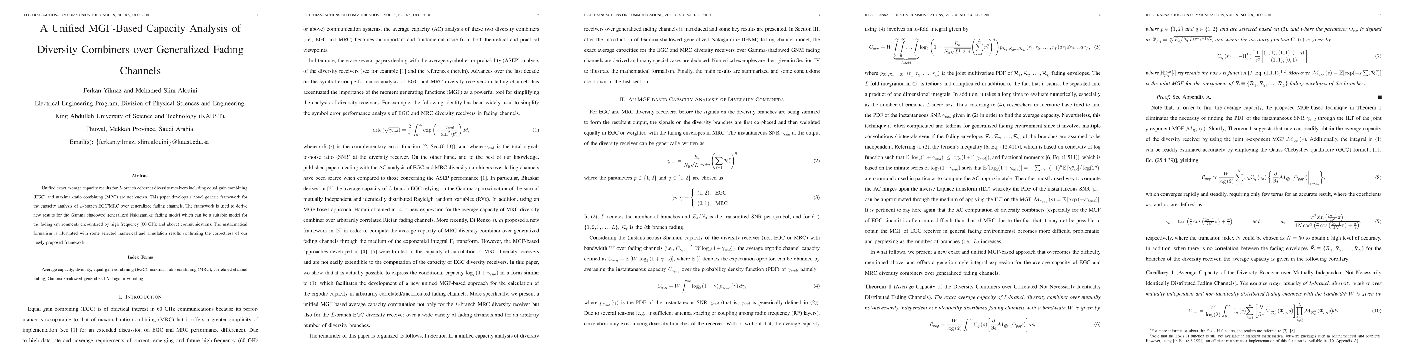 This paper presents a unified MGF-based framework for analyzing the capacity of L-branch diversity combiners, including EGC and MRC, under generalized fading channels. It derives new capacity results for the Gamma shadowed Nakagami-m fading model, suitable for high-frequency communications, and validates the framework through numerical and simulation results.