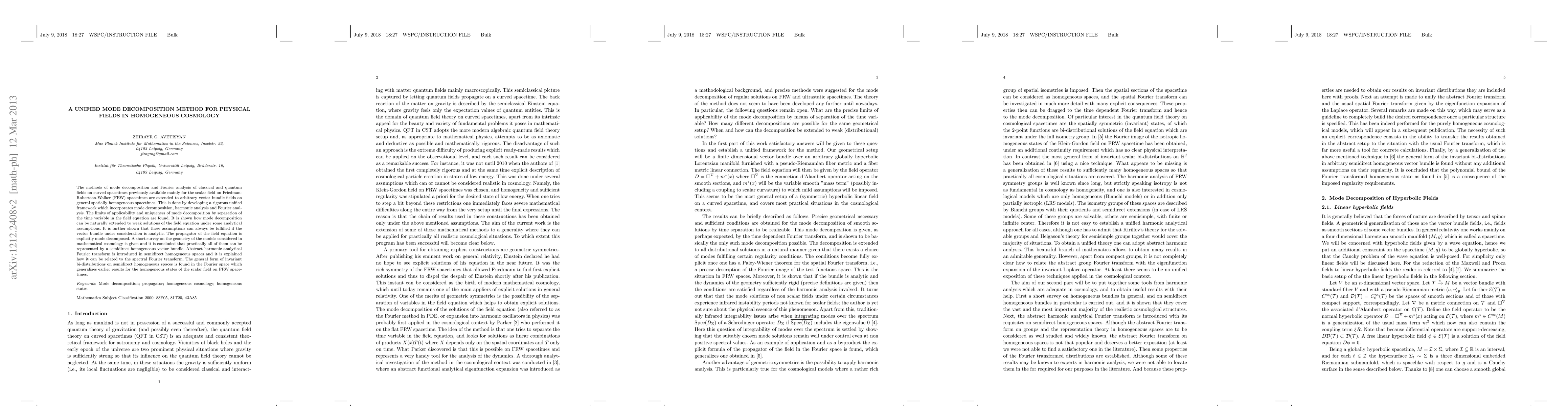 The methods of mode decomposition and Fourier analysis of classical and quantum fields on curved spacetimes previously available mainly for the scalar field on Friedman- Robertson-Walker (FRW) spacetimes are extended to arbitrary vector bundle fields on general spatially homogeneous spacetimes. This is done by developing a rigorous unified framework which incorporates mode decomposition, harmonic analysis and Fourier anal- ysis. The limits of applicability and uniqueness of mode decomposition by separation of the time variable in the field equation are found. It is shown how mode decomposition can be naturally extended to weak solutions of the field equation under some analytical assumptions. It is further shown that these assumptions can always be fulfilled if the vector bundle under consideration is analytic. The propagator of the field equation is explicitly mode decomposed. A short survey on the geometry of the models considered in mathematical cosmology is given and it is concluded that practically all of them can be represented by a semidirect homogeneous vector bundle. Abstract harmonic analytical Fourier transform is introduced in semidirect homogeneous spaces and it is explained how it can be related to the spectral Fourier transform. The general form of invariant bi-distributions on semidirect homogeneous spaces is found in the Fourier space which generalizes earlier results for the homogeneous states of the scalar field on FRW spacetimes.