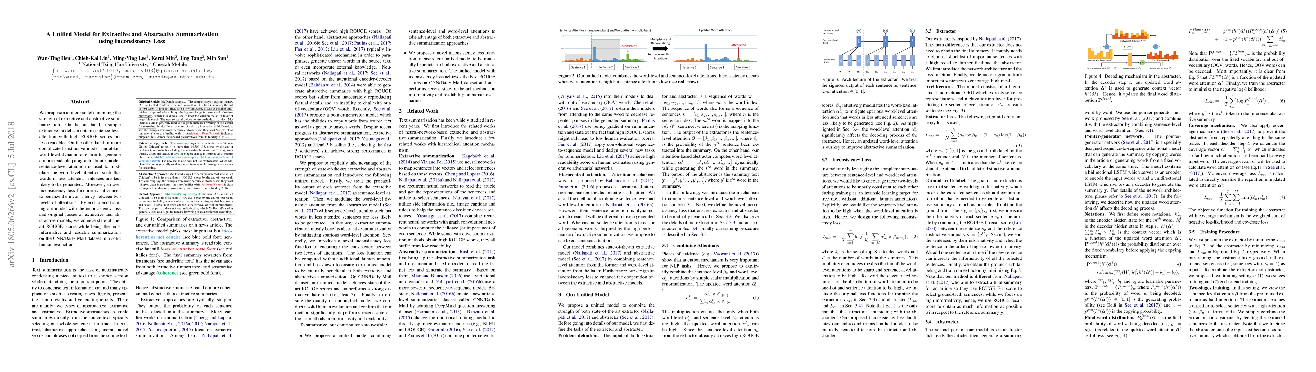 This research introduces a unified model that merges the benefits of both extractive and abstractive summarization techniques. By incorporating a sentence-level attention mechanism to modulate word-level attention, the model aims to generate more coherent and readable summaries while maintaining high information retention. The addition of an inconsistency loss function further refines the model's performance, achieving top ROUGE scores and favorable human evaluations on the CNN/Daily Mail dataset.