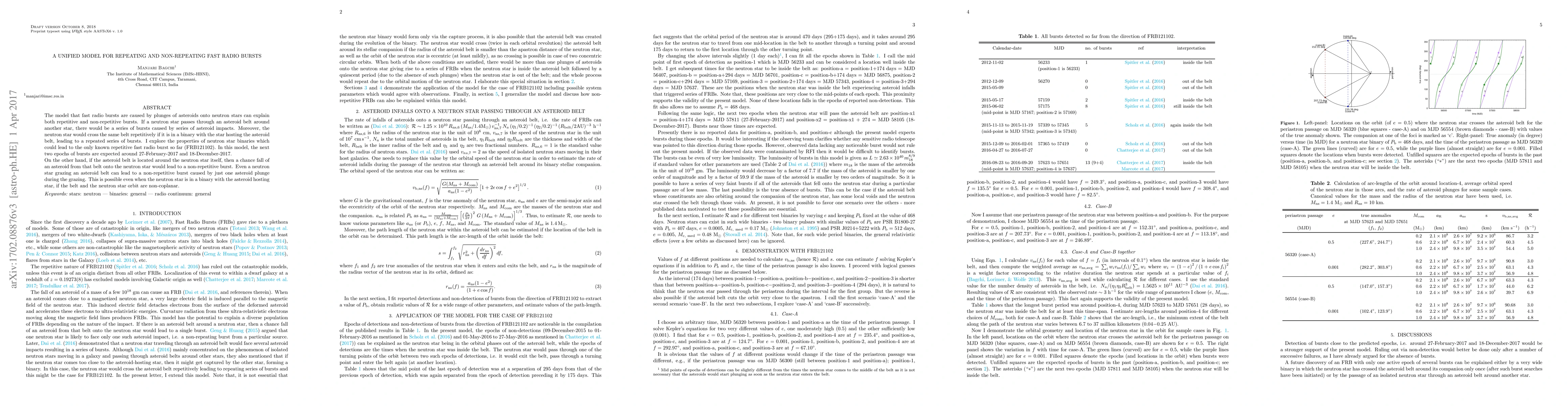 This paper proposes a unified model explaining both repeating and non-repeating fast radio bursts by asteroid impacts on neutron stars. It predicts future bursts from neutron star binaries and explores scenarios where asteroid belts around neutron stars or other stars cause these phenomena.