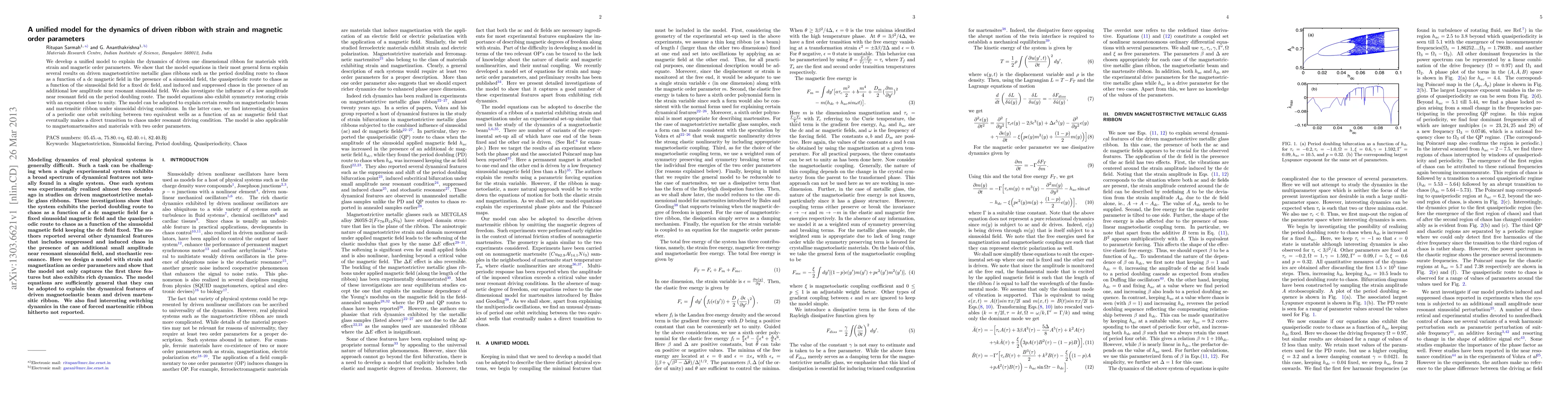 Researchers developed a unified model to study the dynamics of driven ribbons with strain and magnetic order parameters, explaining various chaotic behaviors under different conditions.