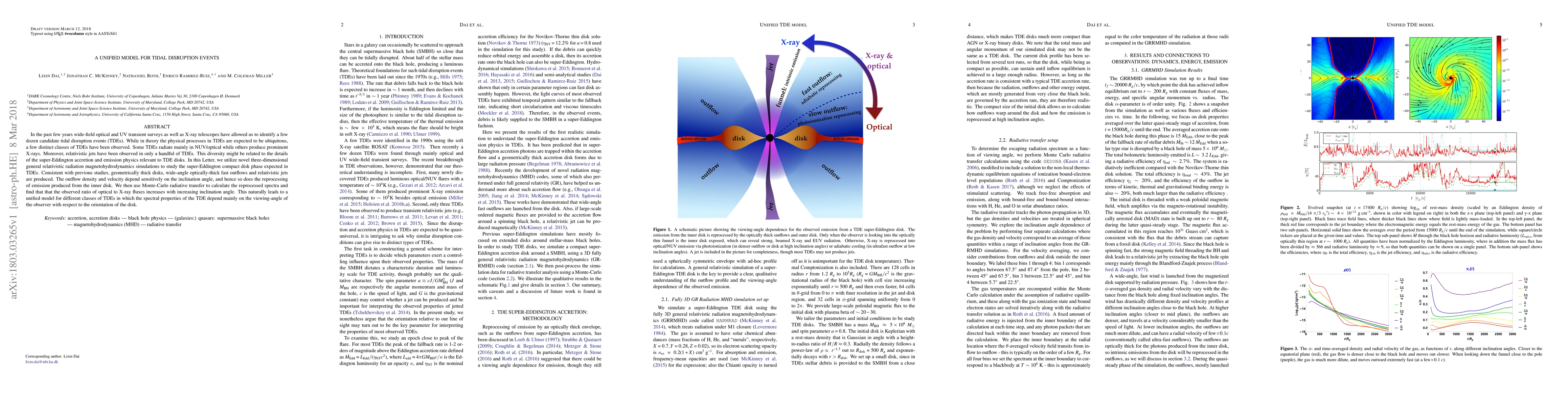 In the past few years wide-field optical and UV transient surveys as well as X-ray telescopes have allowed us to identify a few dozen candidate tidal disruption events (TDEs). While in theory the physical processes in TDEs are expected to be ubiquitous, a few distinct classes of TDEs have been observed. Some TDEs radiate mainly in NUV/optical while others produce prominent X-rays. Moreover, relativistic jets have been observed in only a handful of TDEs. This diversity might be related to the details of the super-Eddington accretion and emission physics relevant to TDE disks. In this Letter, we utilize novel three-dimensional general relativistic radiation magnetohydrodynamics simulations to study the super-Eddington compact disk phase expected in TDEs. Consistent with previous studies, geometrically thick disks, wide-angle optically-thick fast outflows and relativistic jets are produced. The outflow density and velocity depend sensitively on the inclination angle, and hence so does the reprocessing of emission produced from the inner disk. We then use Monte-Carlo radiative transfer to calculate the reprocessed spectra and find that that the observed ratio of optical to X-ray fluxes increases with increasing inclination angle. This naturally leads to a unified model for different classes of TDEs in which the spectral properties of the TDE depend mainly on the viewing-angle of the observer with respect to the orientation of the disk.