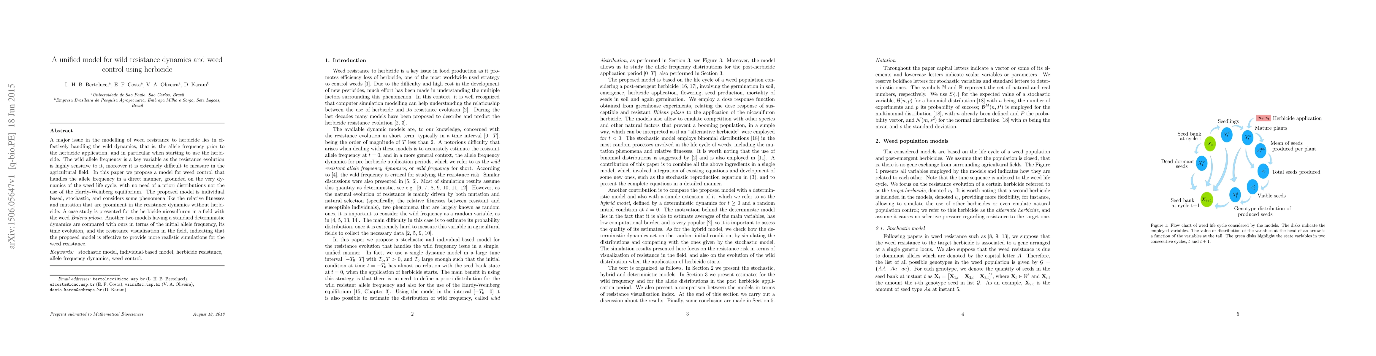 This paper proposes a unified model for simulating weed resistance dynamics and control using herbicides, focusing on accurately capturing the initial wild allele frequency without relying on prior distributions. The model is individual-based, stochastic, and considers factors like relative fitnesses and mutation, demonstrating superior realism compared to standard deterministic models through a case study on nicosulfuron and Bidens pilosa.