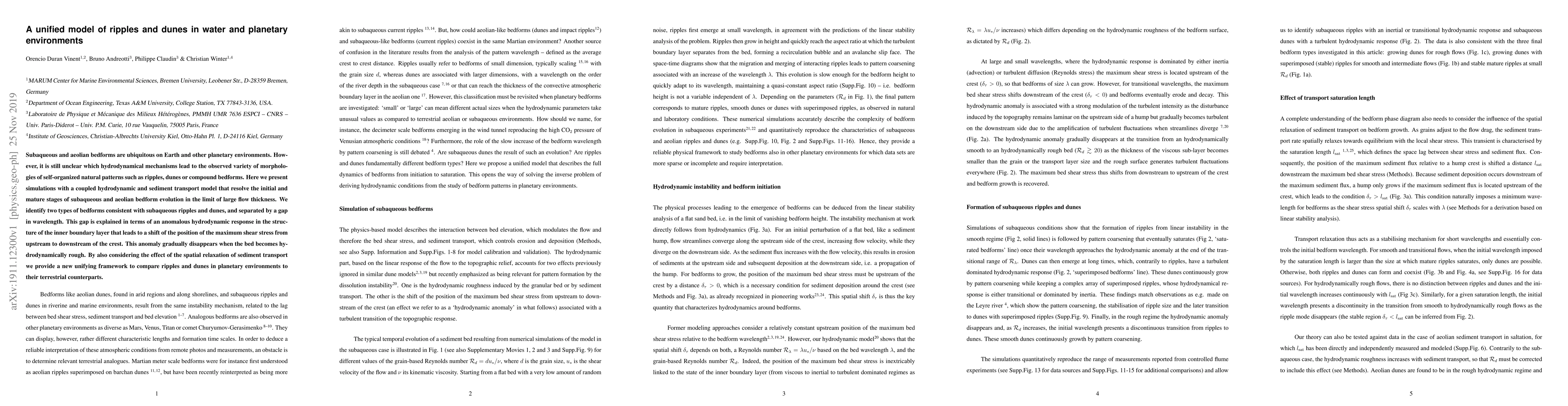 This paper presents a coupled hydrodynamic and sediment transport model to simulate the evolution of ripples and dunes in water and planetary environments, identifying a gap in bedform wavelengths explained by an anomalous hydrodynamic response in the inner boundary layer. The study provides a unifying framework for comparing terrestrial and extraterrestrial bedforms.