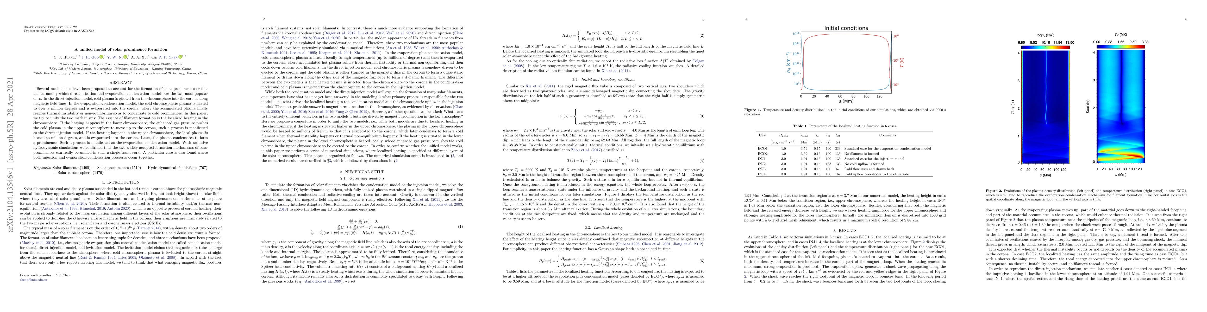 This paper proposes a unified model for solar prominence formation, suggesting that both direct injection and evaporation-condensation mechanisms arise from localized heating in the chromosphere. Depending on the heating location, either cold plasma is pushed into the corona (direct injection) or evaporates into the corona and condenses to form prominences (evaporation-condensation).