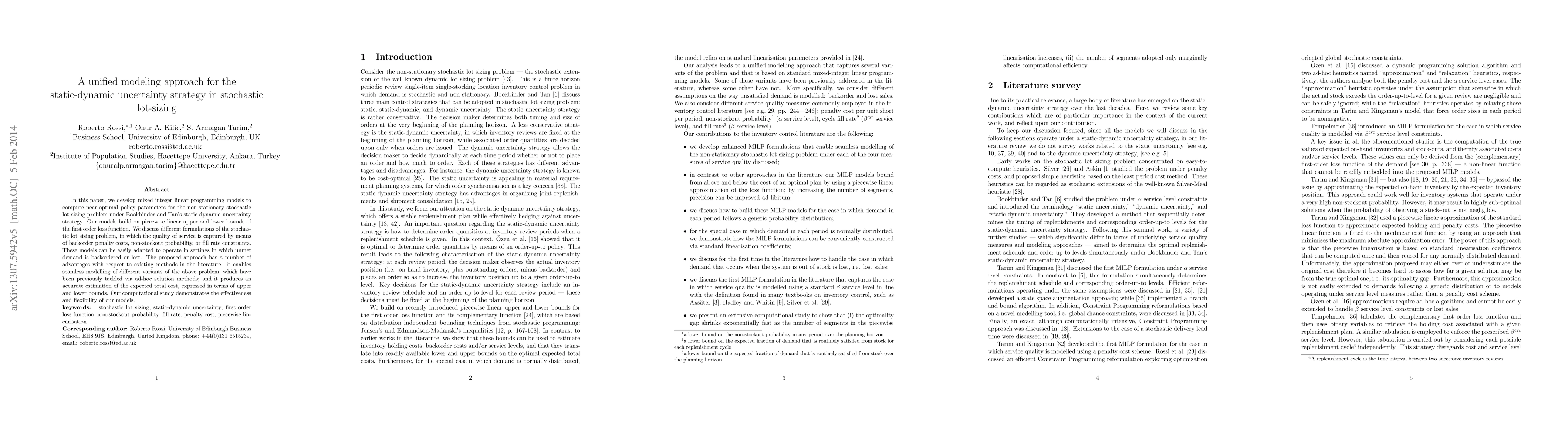 In this paper, we develop mixed integer linear programming models to compute near-optimal policy parameters for the non-stationary stochastic lot sizing problem under Bookbinder and Tan's static-dynamic uncertainty strategy. Our models build on piecewise linear upper and lower bounds of the first order loss function. We discuss different formulations of the stochastic lot sizing problem, in which the quality of service is captured by means of backorder penalty costs, non-stockout probability, or fill rate constraints. These models can be easily adapted to operate in settings in which unmet demand is backordered or lost. The proposed approach has a number of advantages with respect to existing methods in the literature: it enables seamless modelling of different variants of the above problem, which have been previously tackled via ad-hoc solution methods; and it produces an accurate estimation of the expected total cost, expressed in terms of upper and lower bounds. Our computational study demonstrates the effectiveness and flexibility of our models.
