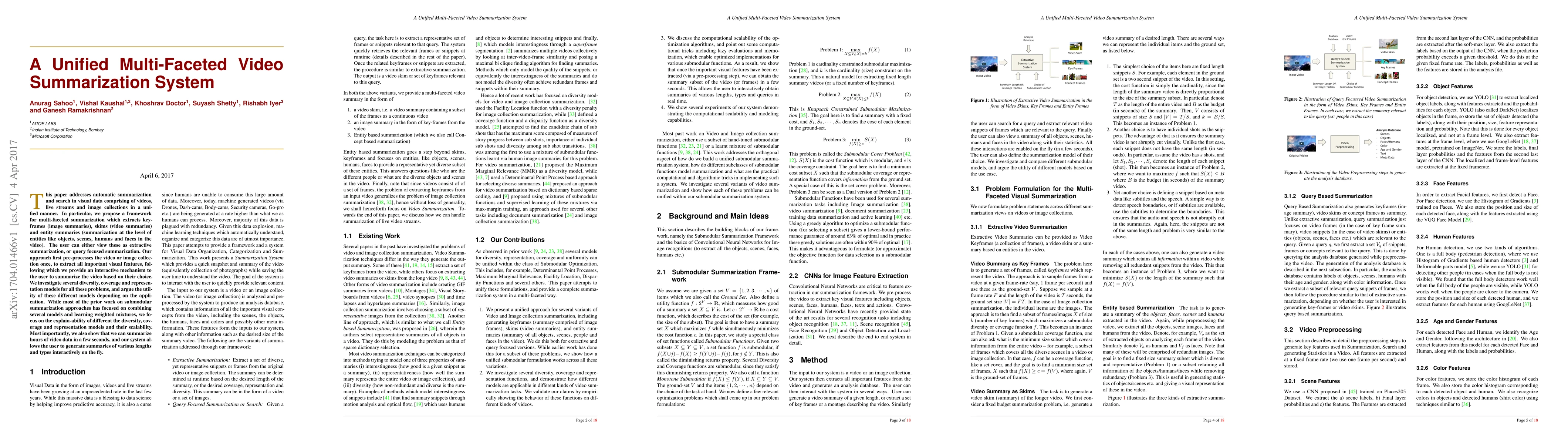 This paper presents a unified framework for multi-faceted video summarization, extracting key-frames, skims, and entity summaries, and allowing users to generate summaries interactively. The system emphasizes explainability and scalability, summarizing hours of video data in seconds.