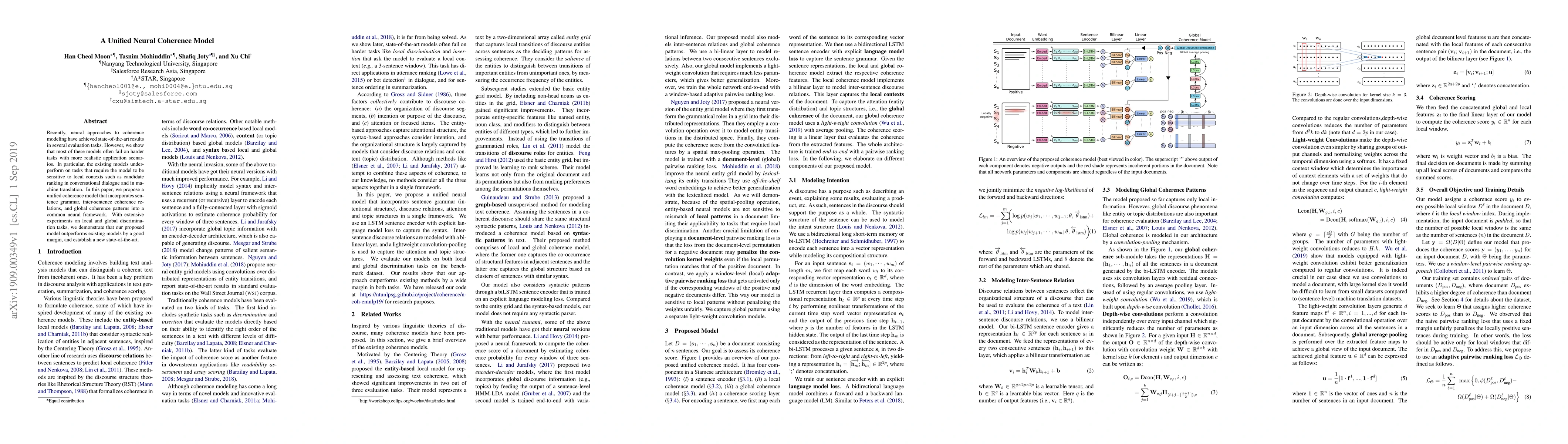 This paper proposes a unified neural coherence model that integrates sentence grammar, inter-sentence coherence relations, and global coherence patterns, outperforming existing models on tasks requiring sensitivity to local contexts, such as conversational dialogue and machine translation. The new model sets a new state-of-the-art in coherence modeling.