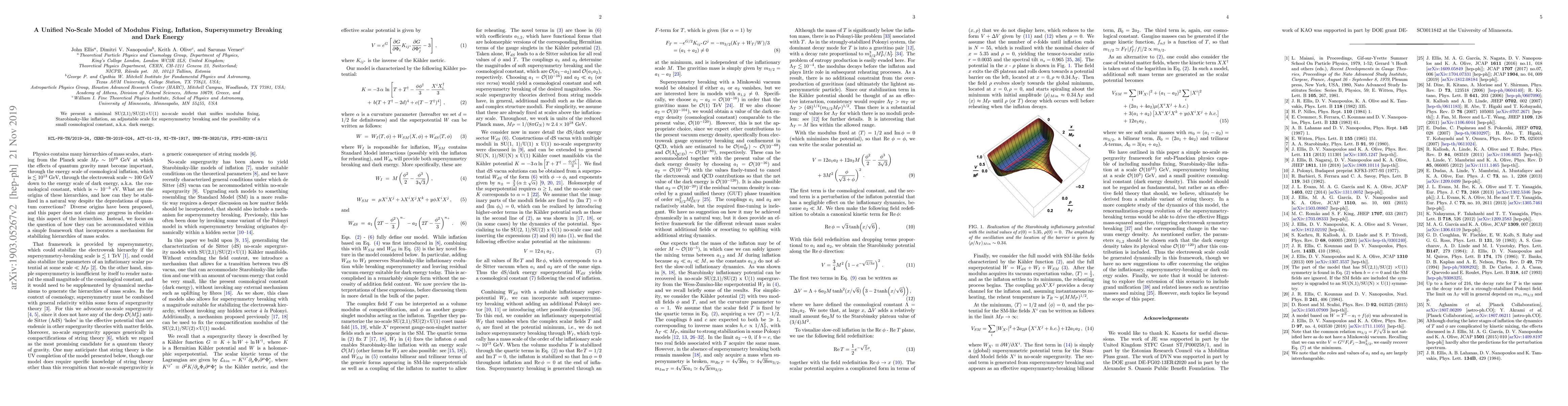 This paper proposes a minimal SU(2,1)/SU(2) x U(1) no-scale model that efficiently integrates modulus fixing, Starobinsky-like inflation, a flexible supersymmetry breaking scale, and potential dark energy. The model aims to unify these fundamental aspects in a coherent framework.