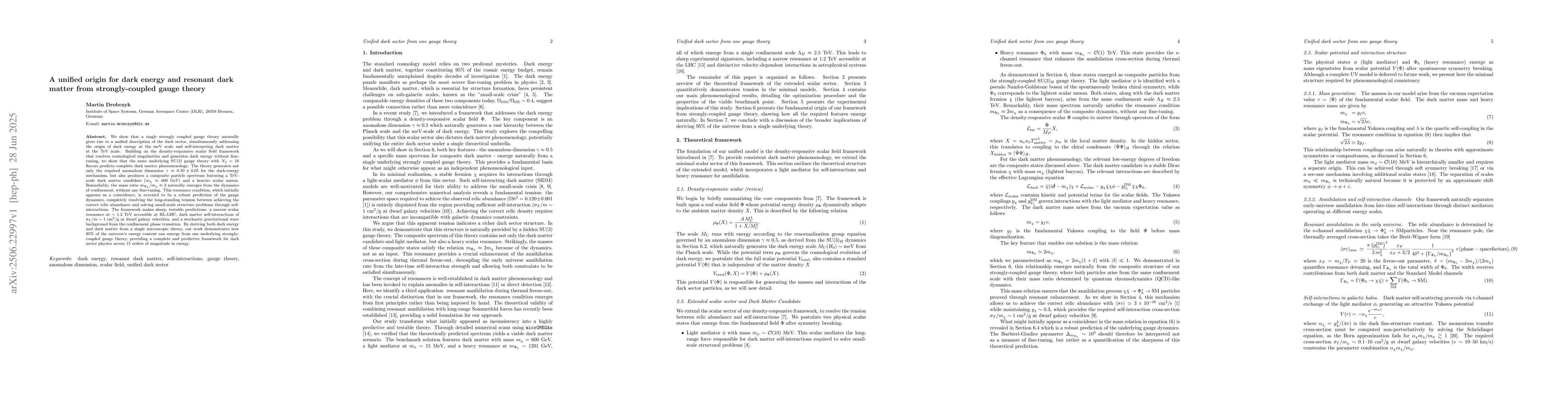 We show that a single strongly coupled gauge theory naturally gives rise to a unified description of the dark sector, simultaneously addressing the origin of dark energy at the meV scale and self-interacting dark matter at the TeV scale. Building on the density-responsive scalar field framework that resolves cosmological singularities and generates dark energy without fine-tuning, we show that the same underlying SU(3) gauge theory with $N_f = 10$ flavors predicts complete dark matter phenomenology. The theory generates not only the required anomalous dimension $\gamma \approx 0.50\pm0.05$ for the dark-energy mechanism, but also produces a composite particle spectrum featuring a TeV-scale dark matter candidate ($m_\chi \approx 600$~GeV) and a heavier scalar meson. Remarkably, the mass ratio $m_{\Phi_h}/m_\chi \approx 2$ naturally emerges from the dynamics of confinement, without any fine-tuning. This resonance condition, which initially appears as a coincidence, is revealed to be a robust prediction of the gauge dynamics, completely resolving the long-standing tension between achieving the correct relic abundance and solving small-scale structure problems through self-interactions. The framework makes sharp, testable predictions: a narrow scalar resonance at $\sim 1.2$~TeV accessible at HL-LHC, dark matter self-interactions of $\sigma_T/m \sim 1$~cm$^2$/g at dwarf galaxy velocities, and a stochastic gravitational wave background from the confinement phase transition. By deriving both dark energy and dark matter from a single microscopic theory, our work demonstrates how 95\% of the universe's energy content can emerge from one underlying strongly-coupled gauge theory, providing a complete and predictive framework for dark sector physics across 15 orders of magnitude in energy.