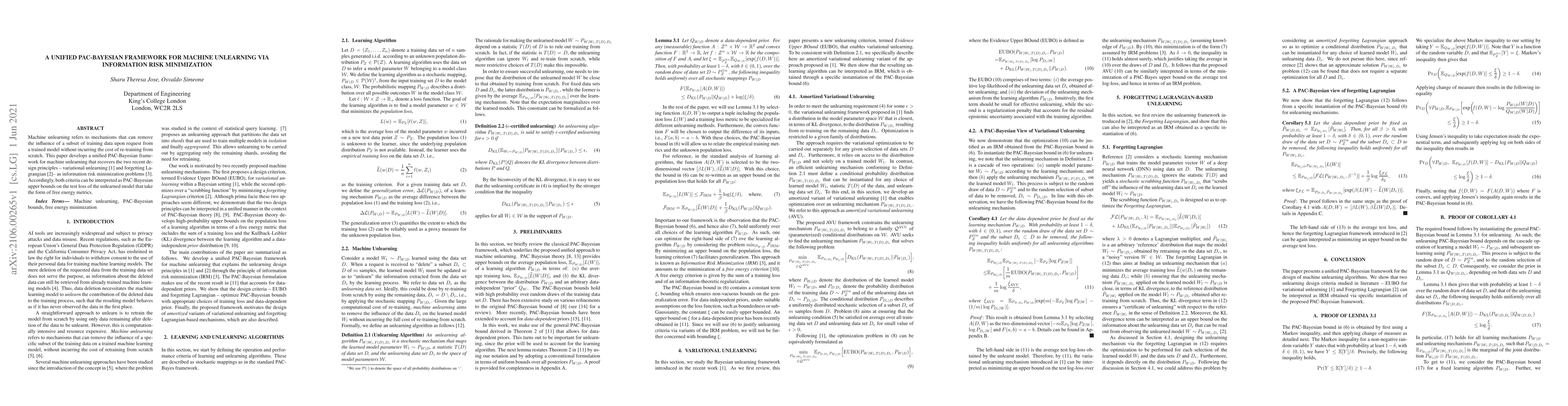 Machine unlearning refers to mechanisms that can remove the influence of a subset of training data upon request from a trained model without incurring the cost of re-training from scratch. This paper develops a unified PAC-Bayesian framework for machine unlearning that recovers the two recent design principles - variational unlearning (Nguyen et.al., 2020) and forgetting Lagrangian (Golatkar et.al., 2020) - as information risk minimization problems (Zhang,2006). Accordingly, both criteria can be interpreted as PAC-Bayesian upper bounds on the test loss of the unlearned model that take the form of free energy metrics.