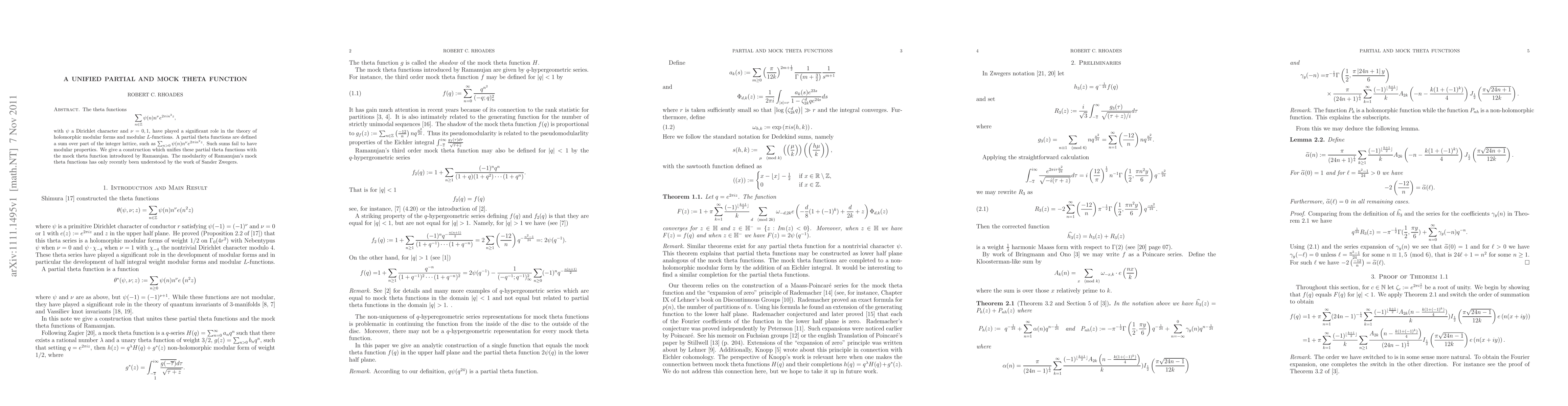 This paper constructs a unified framework that integrates partial theta functions, which sum over part of the integer lattice, and mock theta functions introduced by Ramanujan. It highlights the recent understanding of the modularity of Ramanujan's mock theta functions through the work of Sander Zwegers.