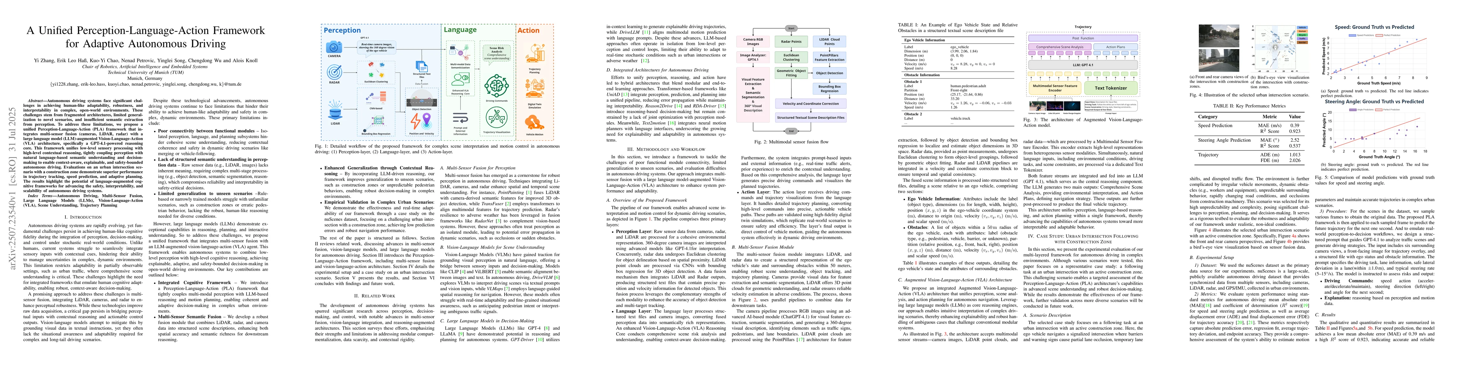 Autonomous driving systems face significant challenges in achieving human-like adaptability, robustness, and interpretability in complex, open-world environments. These challenges stem from fragmented architectures, limited generalization to novel scenarios, and insufficient semantic extraction from perception. To address these limitations, we propose a unified Perception-Language-Action (PLA) framework that integrates multi-sensor fusion (cameras, LiDAR, radar) with a large language model (LLM)-augmented Vision-Language-Action (VLA) architecture, specifically a GPT-4.1-powered reasoning core. This framework unifies low-level sensory processing with high-level contextual reasoning, tightly coupling perception with natural language-based semantic understanding and decision-making to enable context-aware, explainable, and safety-bounded autonomous driving. Evaluations on an urban intersection scenario with a construction zone demonstrate superior performance in trajectory tracking, speed prediction, and adaptive planning. The results highlight the potential of language-augmented cognitive frameworks for advancing the safety, interpretability, and scalability of autonomous driving systems.
