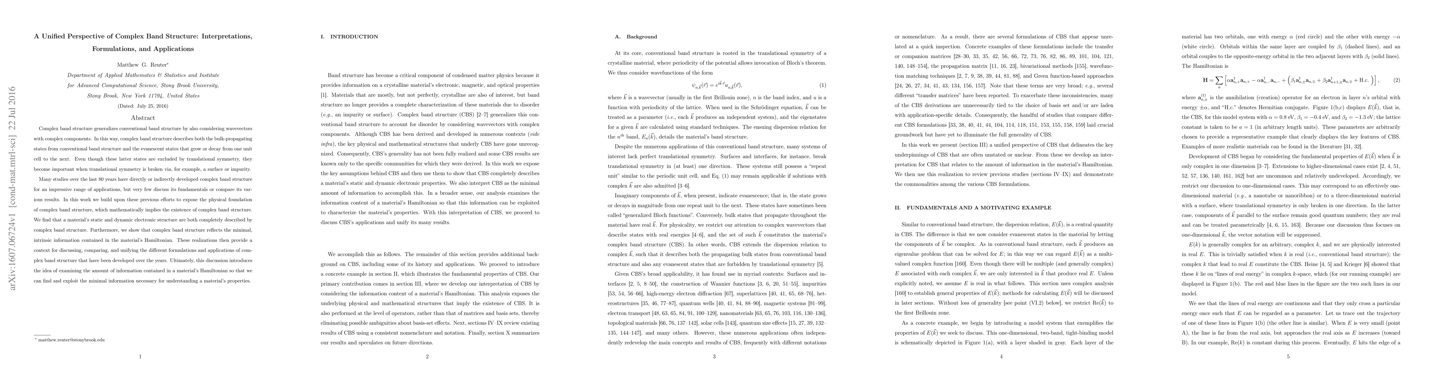 Complex band structure generalizes conventional band structure by also considering wavevectors with complex components. In this way, complex band structure describes both the bulk-propagating states from conventional band structure and the evanescent states that grow or decay from one unit cell to the next. Even though these latter states are excluded by translational symmetry, they become important when translational symmetry is broken via, for example, a surface or impurity. Many studies over the last 80 years have directly or indirectly developed complex band structure for an impressive range of applications, but very few discuss its fundamentals or compare its various results. In this work we build upon these previous efforts to expose the physical foundation of complex band structure, which mathematically implies the existence of complex band structure. We find that a material's static and dynamic electronic structure are both completely described by complex band structure. Furthermore, we show that complex band structure reflects the minimal, intrinsic information contained in the material's Hamiltonian. These realizations then provide a context for discussing, comparing, and unifying the different formulations and applications of complex band structure that have been developed over the years. Ultimately, this discussion introduces the idea of examining the amount of information contained in a material's Hamiltonian so that we can find and exploit the minimal information necessary for understanding a material's properties.