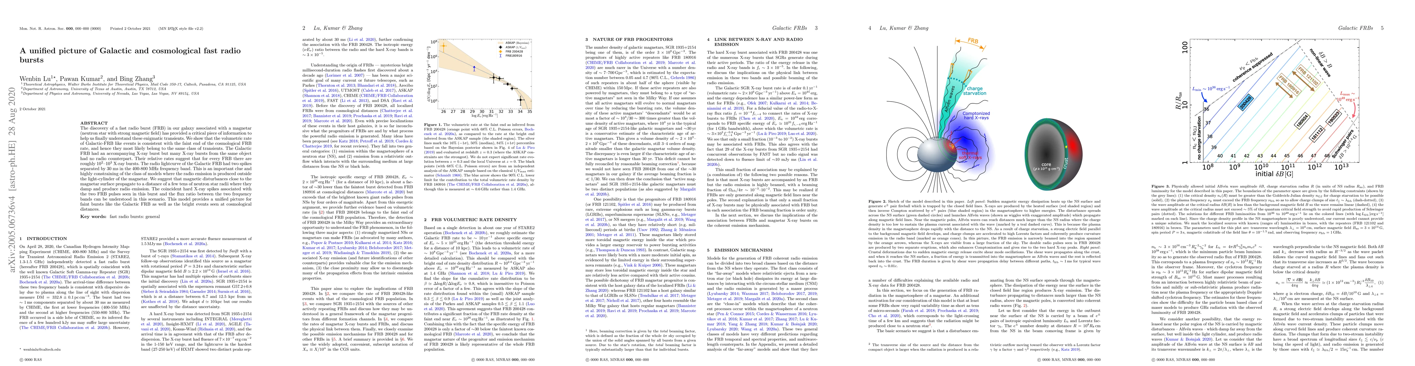 This paper reveals a unified model for both Galactic and cosmological fast radio bursts (FRBs), suggesting they belong to the same class of transients. The study finds that Galactic FRBs likely originate from magnetars, with their radio emission produced by magnetic disturbances propagating from the magnetar surface.