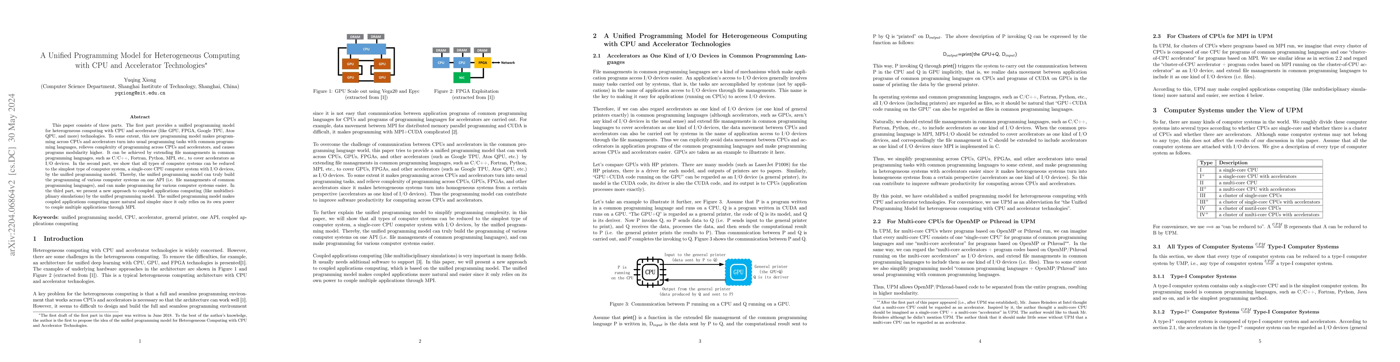 This paper consists of three parts. The first part provides a unified programming model for heterogeneous computing with CPU and accelerator (like GPU, FPGA, Google TPU, Atos QPU, and more) technologies. To some extent, this new programming model makes programming across CPUs and accelerators turn into usual programming tasks with common programming languages, and relieves complexity of programming across CPUs and accelerators. It can be achieved by extending file managements in common programming languages, such as C/C++, Fortran, Python, MPI, etc., to cover accelerators as I/O devices. In the second part, we show that all types of computer systems can be reduced to the simplest type of computer system, a single-core CPU computer system with I/O devices, by the unified programming model. Thereby, the unified programming model can truly build the programming of various computer systems on one API (i.e. file managements of common programming languages), and can make programming for various computer systems easier. In third part, we present a new approach to coupled applications computing (like multidisciplinary simulations) by the unified programming model. The unified programming model makes coupled applications computing more natural and easier since it only relies on its own power to couple multiple applications through MPI.