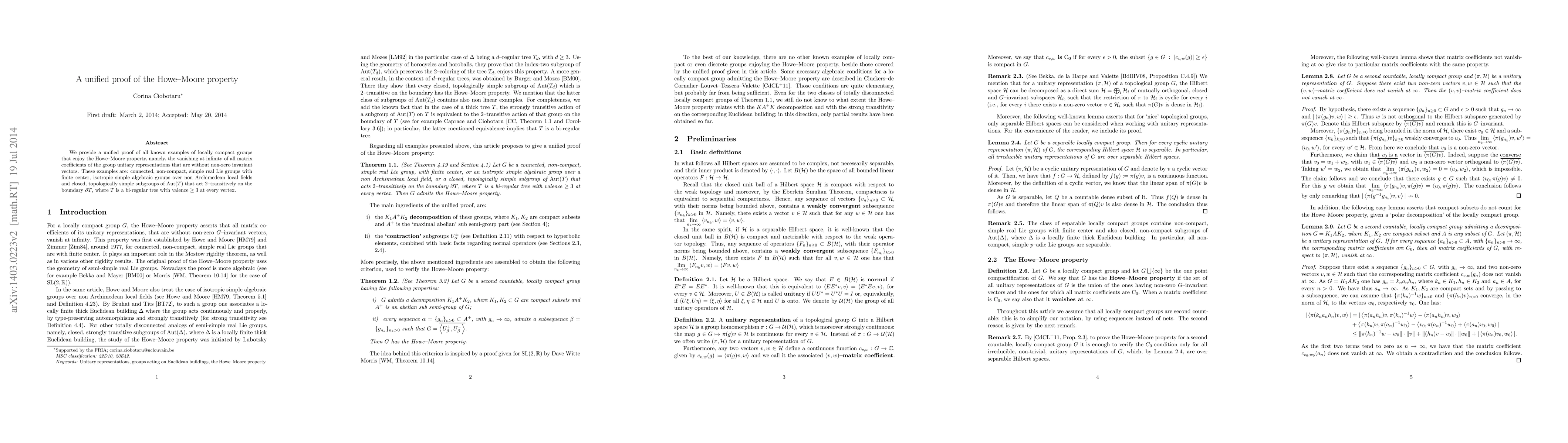This paper presents a unified proof for the Howe-Moore property in several locally compact groups, including connected non-compact simple real Lie groups and isotropic simple algebraic groups, ensuring vanishing at infinity for matrix coefficients of unitary representations without non-zero invariant vectors.