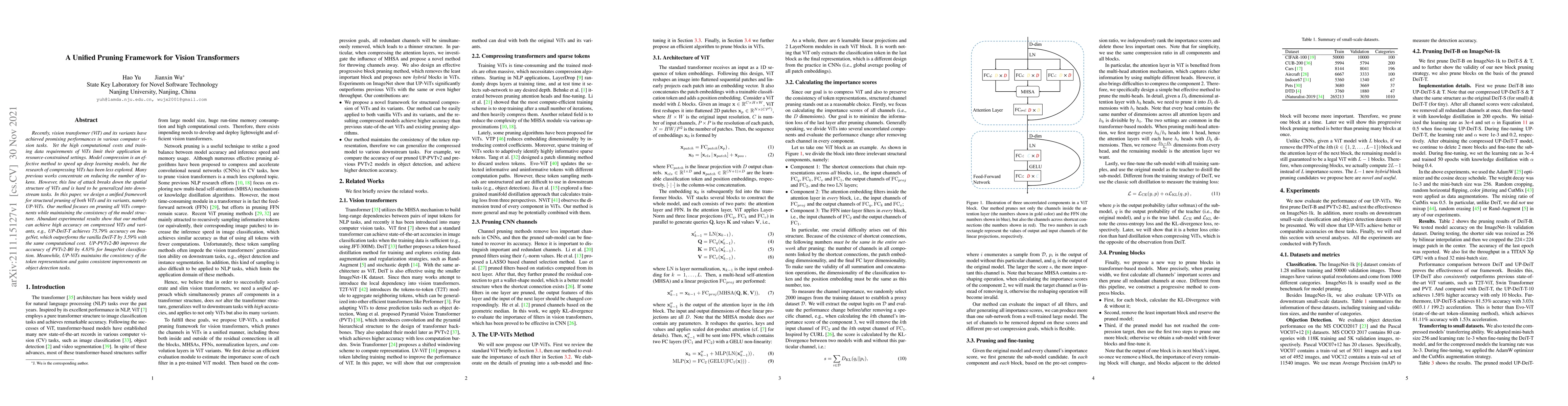 This paper introduces a unified pruning framework, UP-ViTs, for compressing Vision Transformers (ViTs) and their variants, achieving high accuracy while maintaining model structure consistency. Experimental results show significant improvements in accuracy for compressed models, such as UP-DeiT-T and UP-PVTv2-B0, on ImageNet classification and object detection tasks.