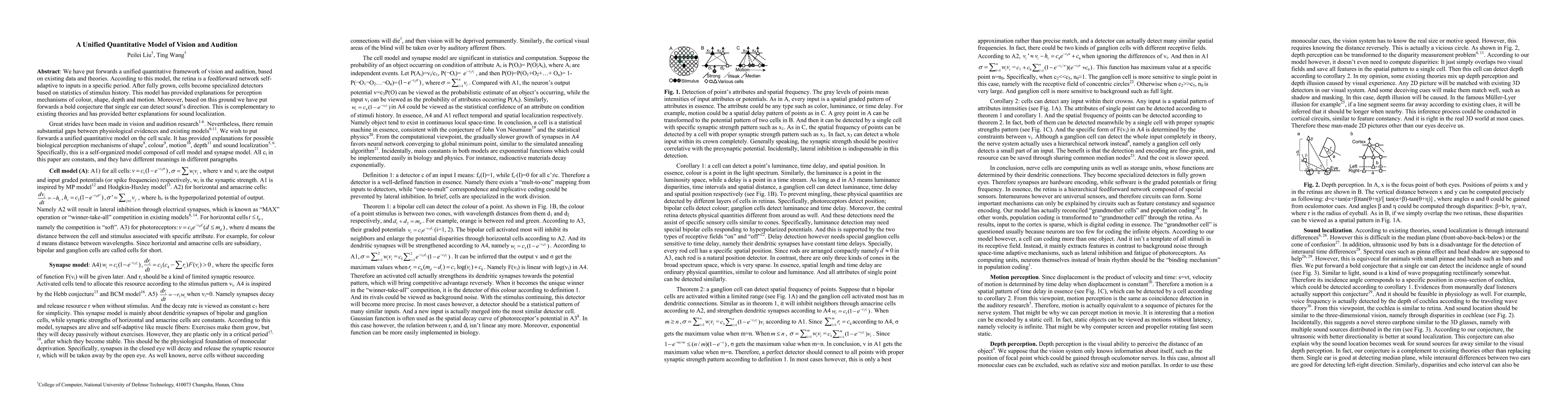 We have put forwards a unified quantitative framework of vision and audition, based on existing data and theories. According to this model, the retina is a feedforward network self-adaptive to inputs in a specific period. After fully grown, cells become specialized detectors based on statistics of stimulus history. This model has provided explanations for perception mechanisms of colour, shape, depth and motion. Moreover, based on this ground we have put forwards a bold conjecture that single ear can detect sound direction. This is complementary to existing theories and has provided better explanations for sound localization.