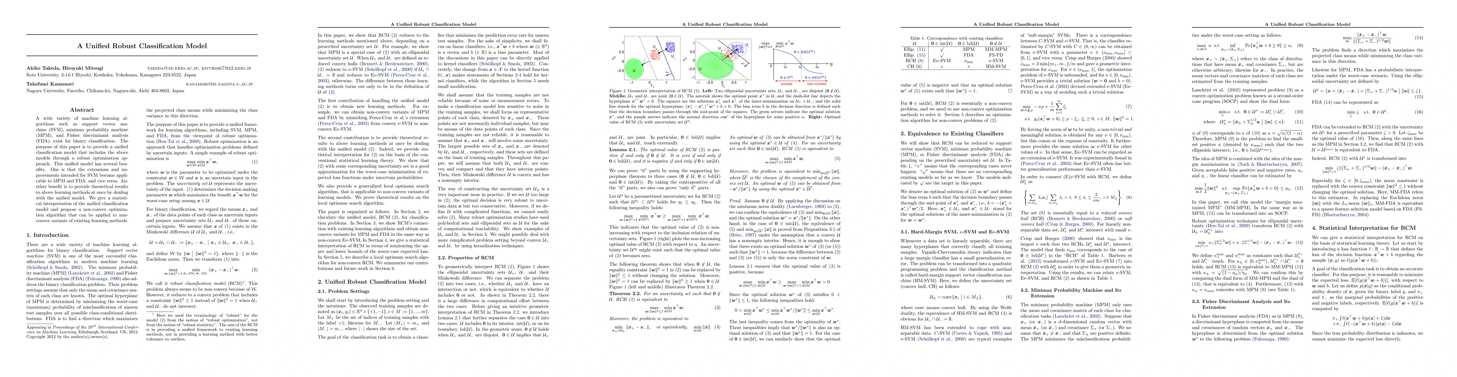 A wide variety of machine learning algorithms such as support vector machine (SVM), minimax probability machine (MPM), and Fisher discriminant analysis (FDA), exist for binary classification. The purpose of this paper is to provide a unified classification model that includes the above models through a robust optimization approach. This unified model has several benefits. One is that the extensions and improvements intended for SVM become applicable to MPM and FDA, and vice versa. Another benefit is to provide theoretical results to above learning methods at once by dealing with the unified model. We give a statistical interpretation of the unified classification model and propose a non-convex optimization algorithm that can be applied to non-convex variants of existing learning methods.