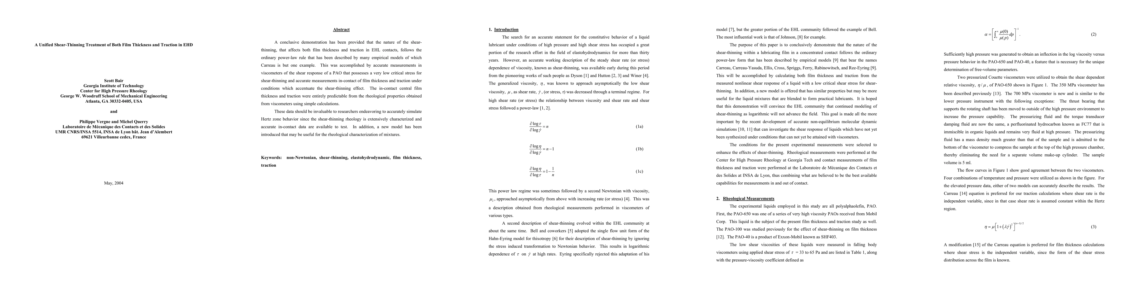 A conclusive demonstration has been provided that the nature of the shear-thinning, that affects both film thickness and traction in EHL contacts, follows the ordinary power-law rule that has been described by many empirical models of which Carreau is but one example. This was accomplished by accurate measurements in viscometers of the shear response of a PAO that possesses a very low critical stress for shear-thinning and accurate measurements in-contact of film thickness and traction under conditions which accentuate the shear-thinning effect. The in-contact central film thickness and traction were entirely predictable from the rheological properties obtained from viscometers using simple calculations. These data should be invaluable to researchers endeavoring to accurately simulate Hertz zone behavior since the shear-thinning rheology is extensively characterized and accurate in-contact data are available to test. In addition, a new model has been introduced that may be useful for the rheological characterization of mixtures.